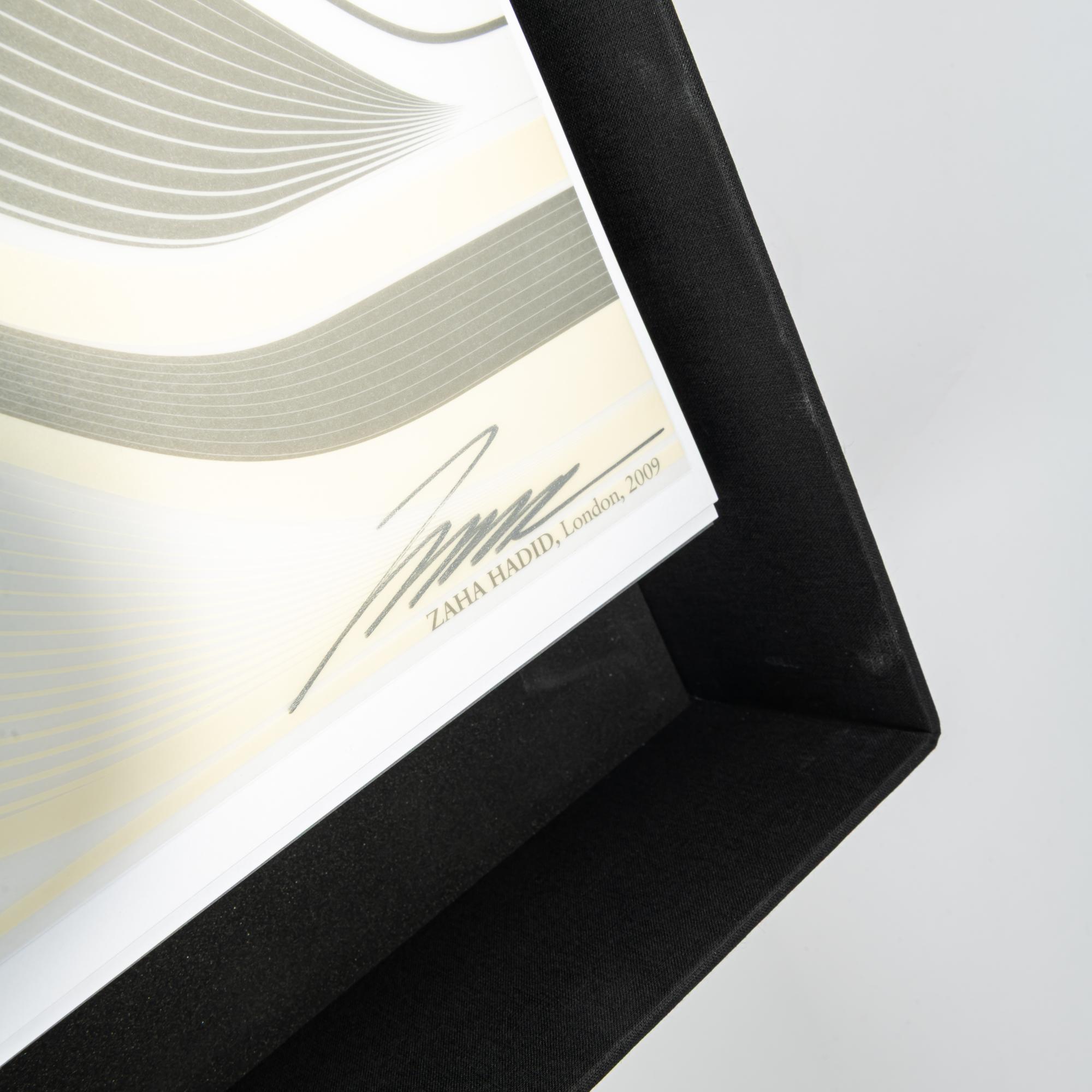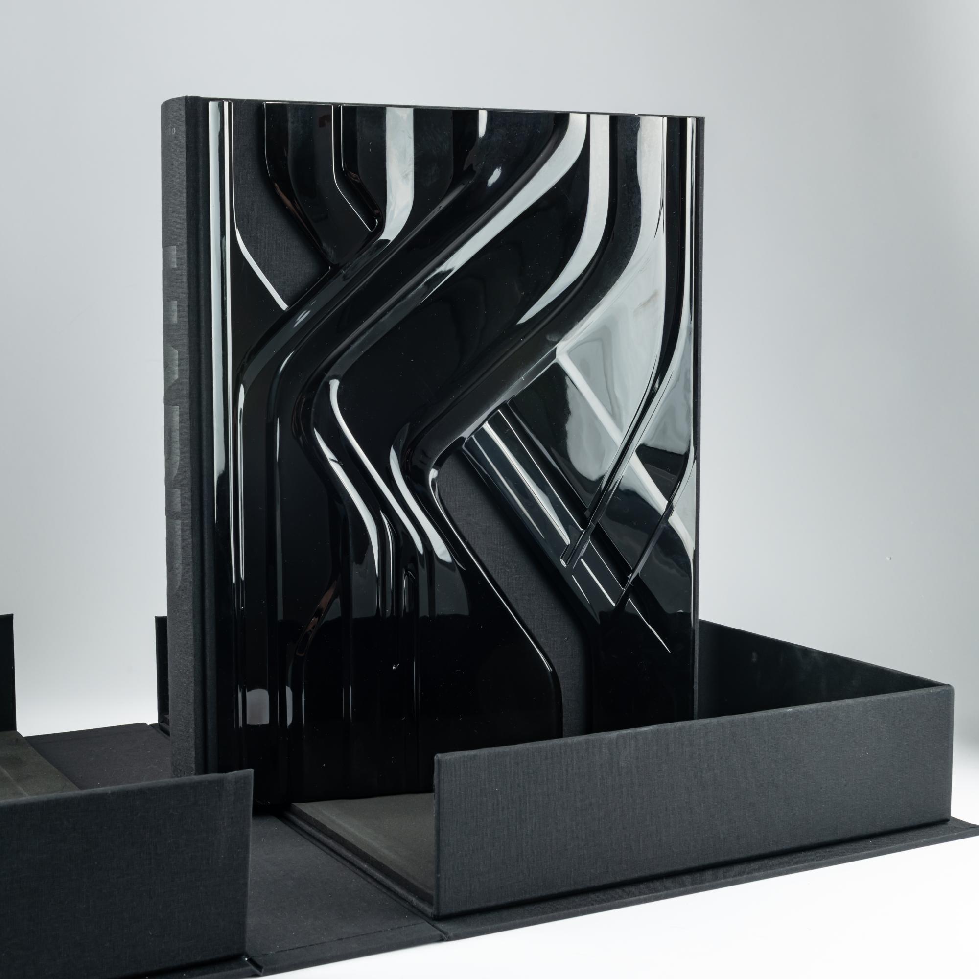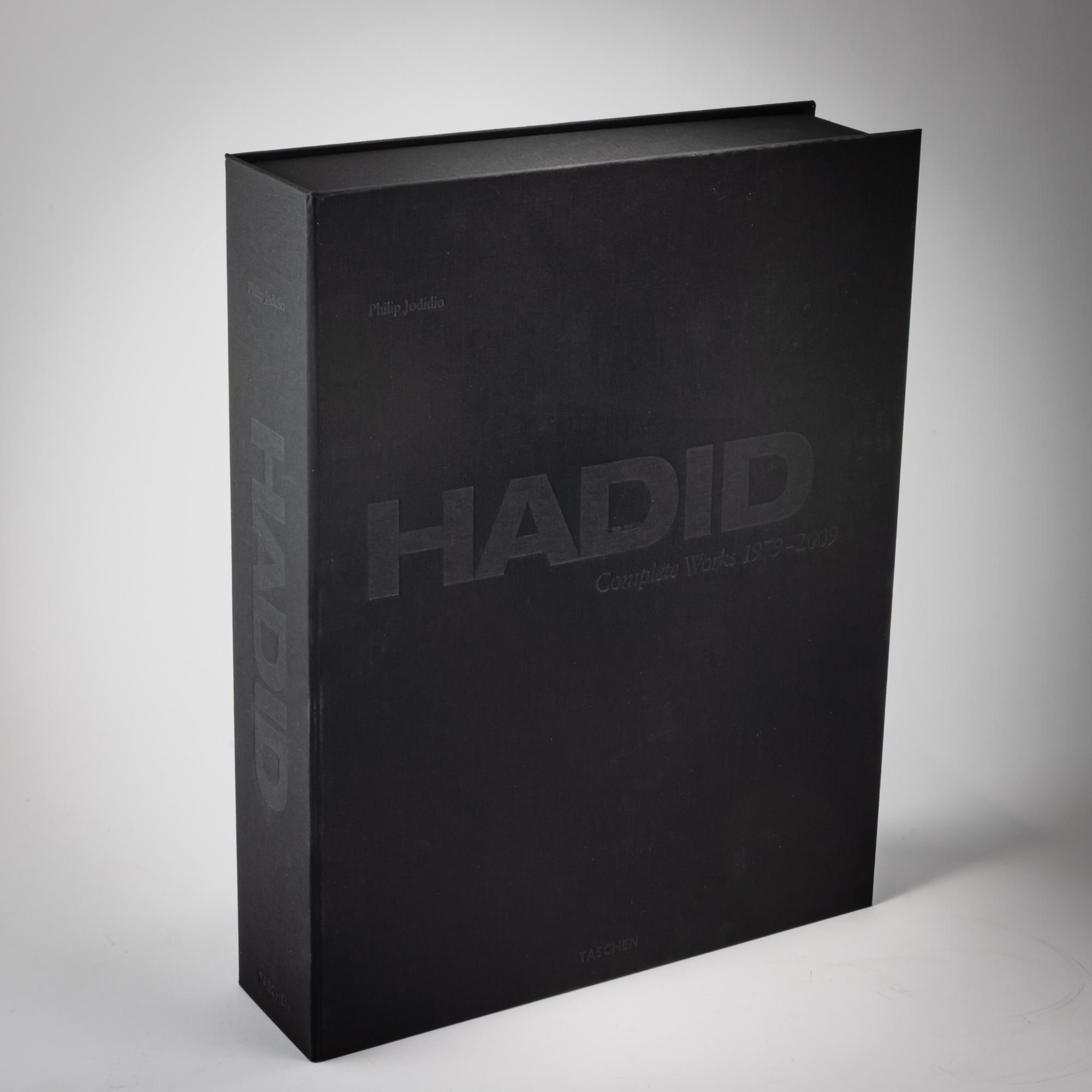 Zaha Hadid. Complete Works 1979–2009. Art Edition XXL, 600 Seiten in schwarzer Schlagkassette und maßgefertigtem, von Hadid entworfenem Cover (hochglanzpoliertes, schwarzes Acryl), hrsg. vom Taschen Verlag, Köln. Auf dem Vorsatzblatt nummeriert: 156 (gedruckt) und handschriftlich signiert: Zaha Hadid (silberner Faserstift). Exemplar 156 von 200 Exemplaren (+20 AP).