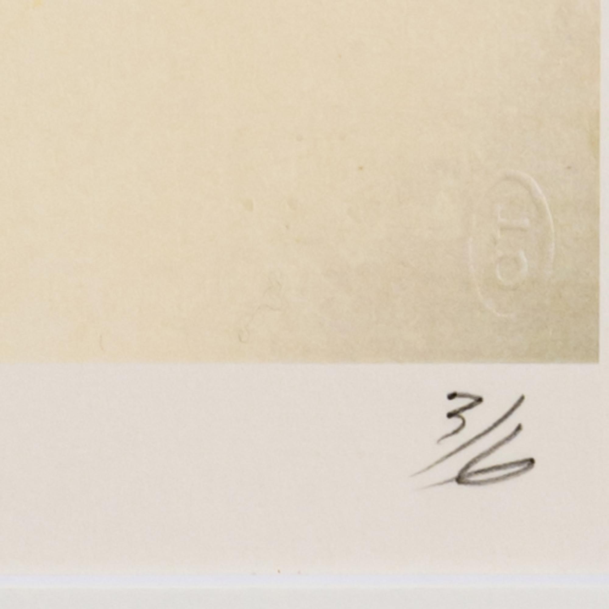 Farbiger Dryprint auf Karton. 43,1 x 27,9 cm (Blatt), 61,0 x 46,0 cm (Rahmen). Unten links monogrammiert: CT, unten rechts nummeriert: 3/6 (Bleistift) sowie ein Trockenstempel: CT. Exemplar 3 von 6 Exemplaren. Unter Glas im Passepartout gerahmt.