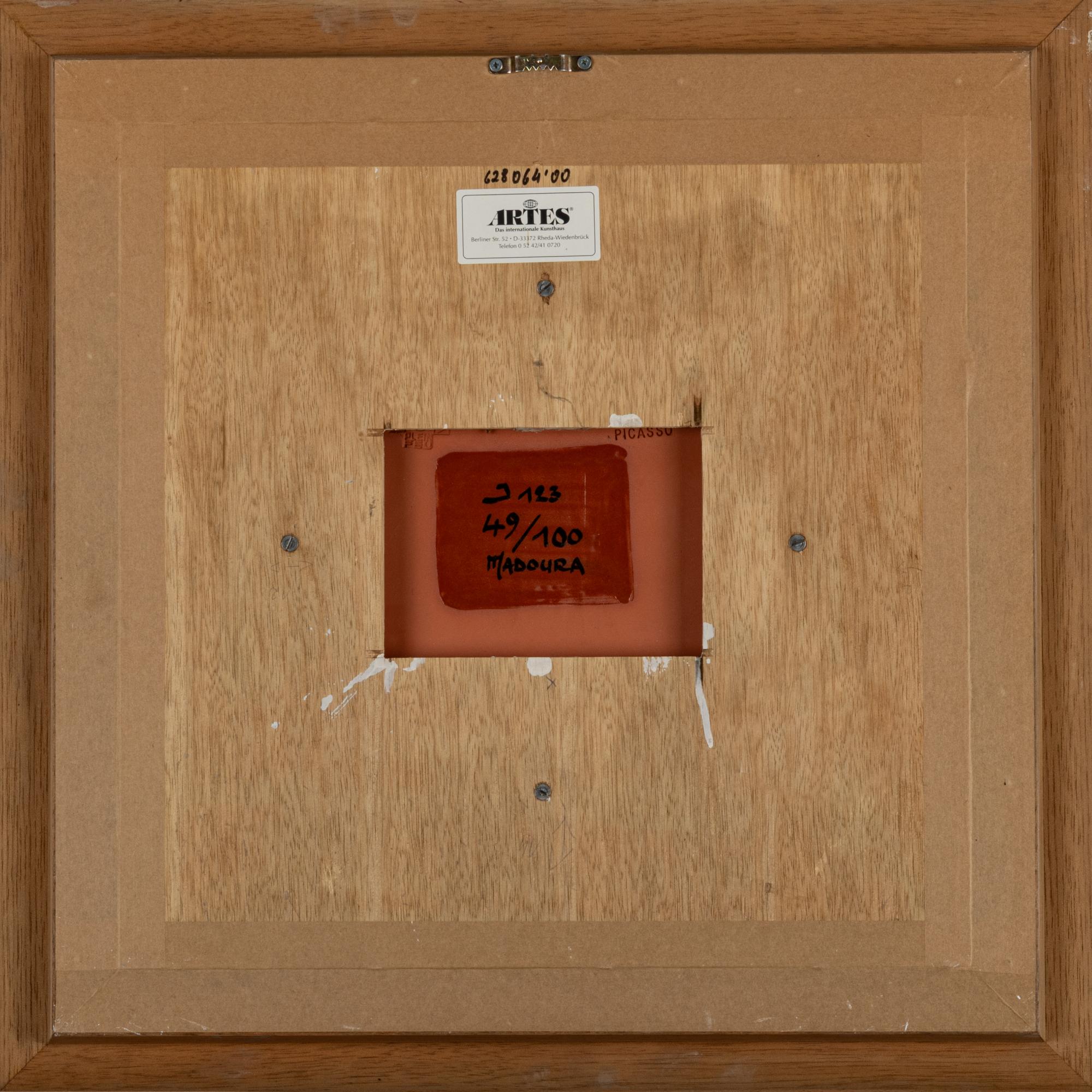 Terrakotta Fliese, teilweise glasiert. 21,7 x 21,7 cm (Fliese), 51,0 x 51,0 cm (Rahmen). Verso bezeichnet und nummeriert: J 123 / 49/100 / MADOURA (schwarze Glasur) sowie mit Stempeln: MADOURA PLEIN FEU; EMPREINTE ORIGINALE DE PICASSO. Exemplar 49 von 100 Exemplaren; 1968 (Entwurf) 1969 (Ausführung).