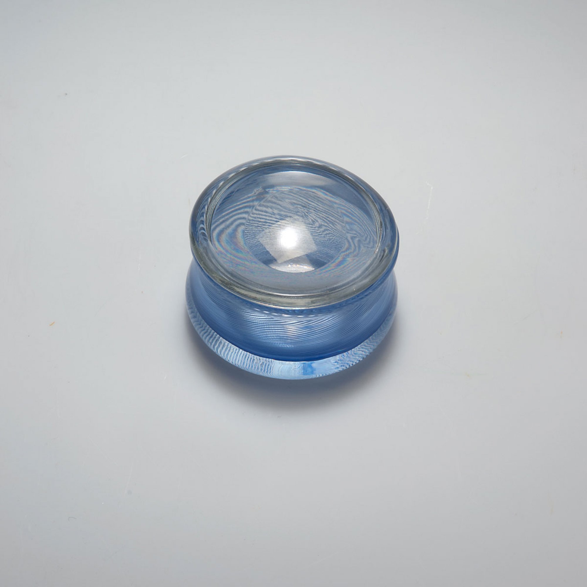 H. 7 cm; Dm. 9,5 cm. Ausführung: Venini & C. Überfangglas, farblos mit blauer Fadeneinlage; Deckel in Linsenform, farblos. Am Boden bez.: venini murano, Angelo Alma 1939 (Ätzstempel).