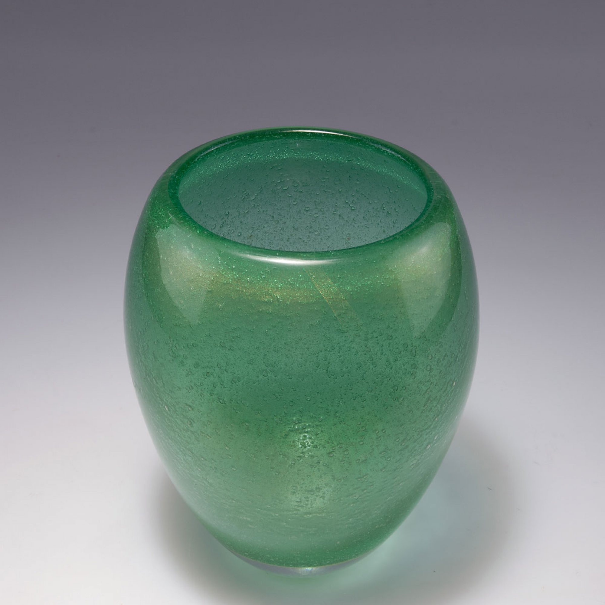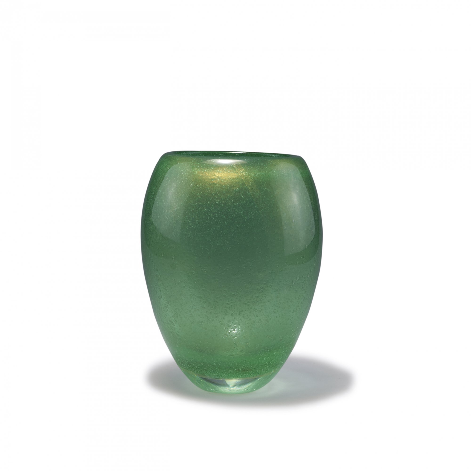 Ovalform. H. 24,5 cm. Ausführung: Venini & C. Überfangglas, farblos und jadegrün mit Luftblasen und fein zersprengter Goldfolie. Am Boden bez.: venini murano ITALIA (Ätzstempel).