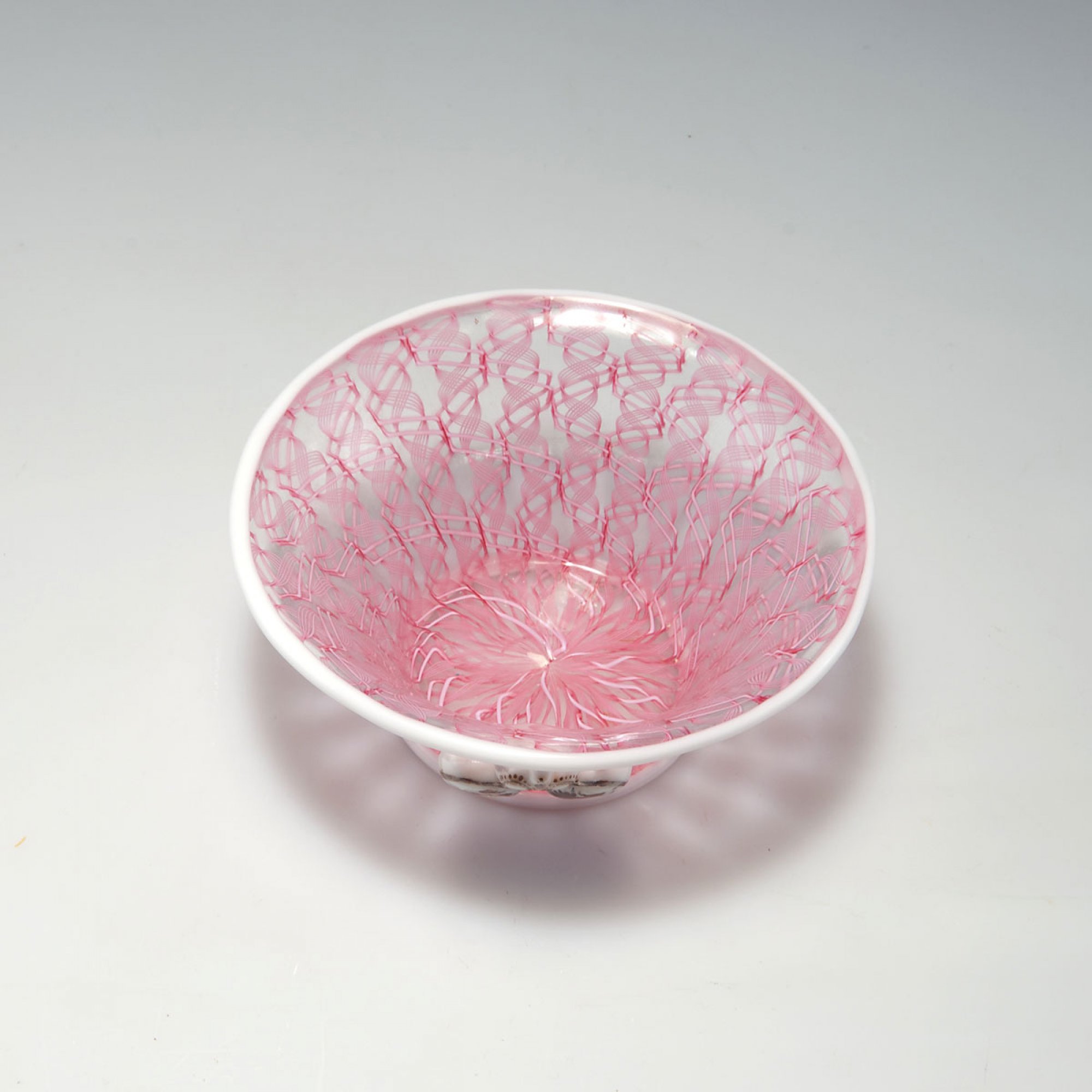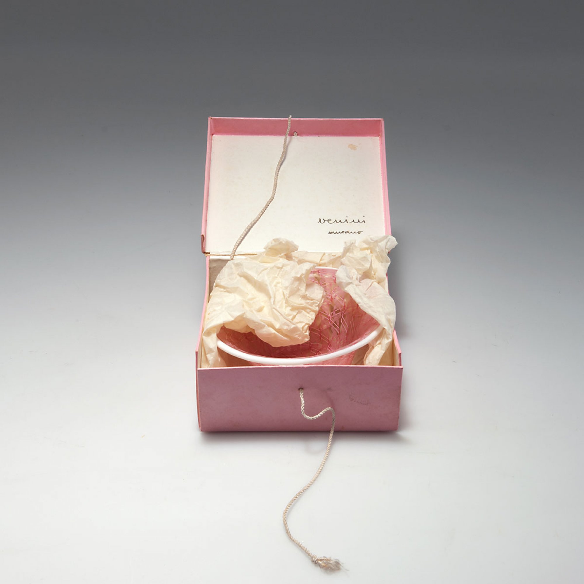 Weite Glockenform. H. 5,2 cm. Ausführung: Venini & C. Miteinander verschmolzene Bänder aus farblosem Glas mit rosa Spiralfäden, Standring, Mündung und appliziertes Wappen in Weiß, Wappen mit Goldbemalung. Am Boden bez.: venini murano ITALIA (Ätzstempel). In Originalkarton mit Klappdeckel, verschnürt. Bez.: venini murano (Stempel in Gold).