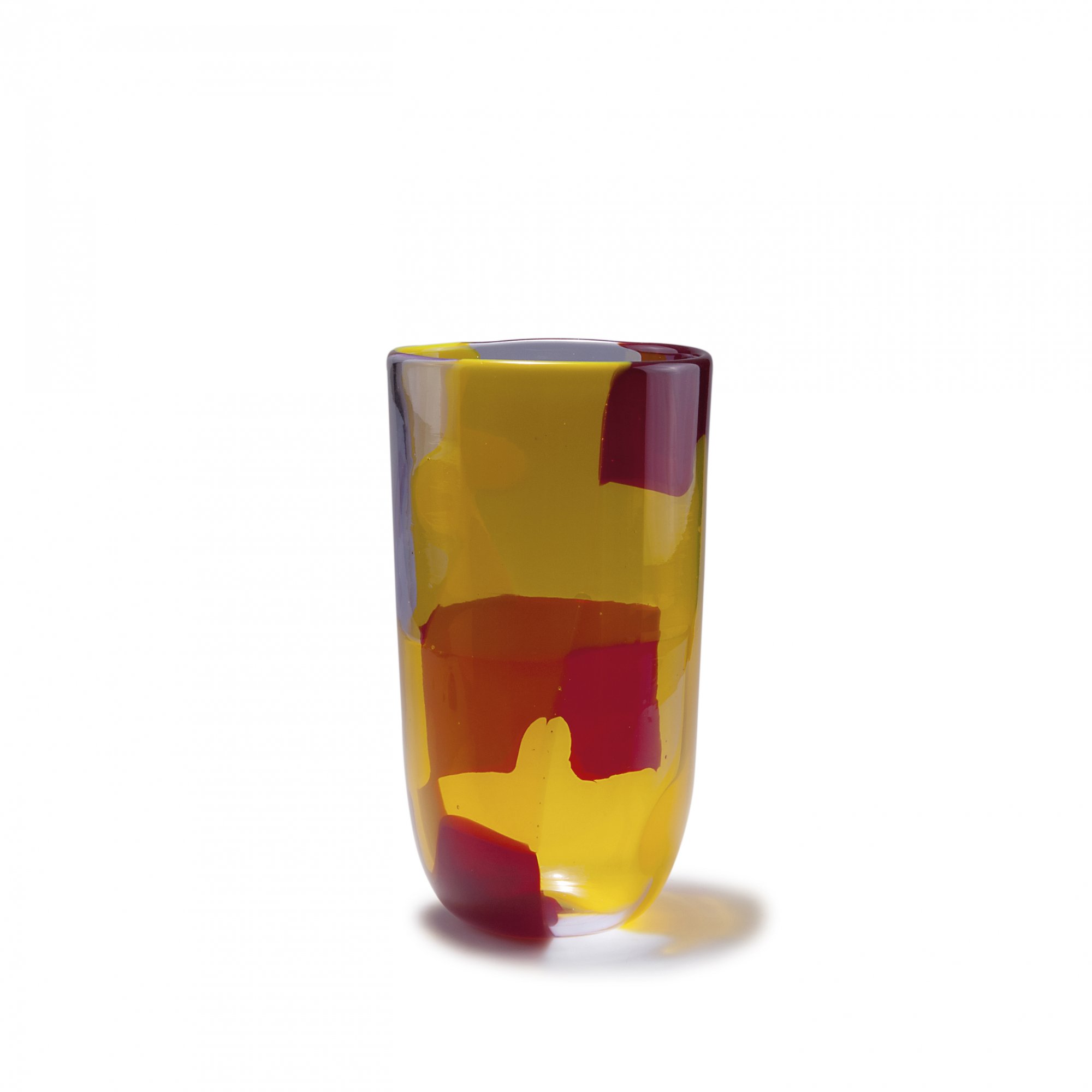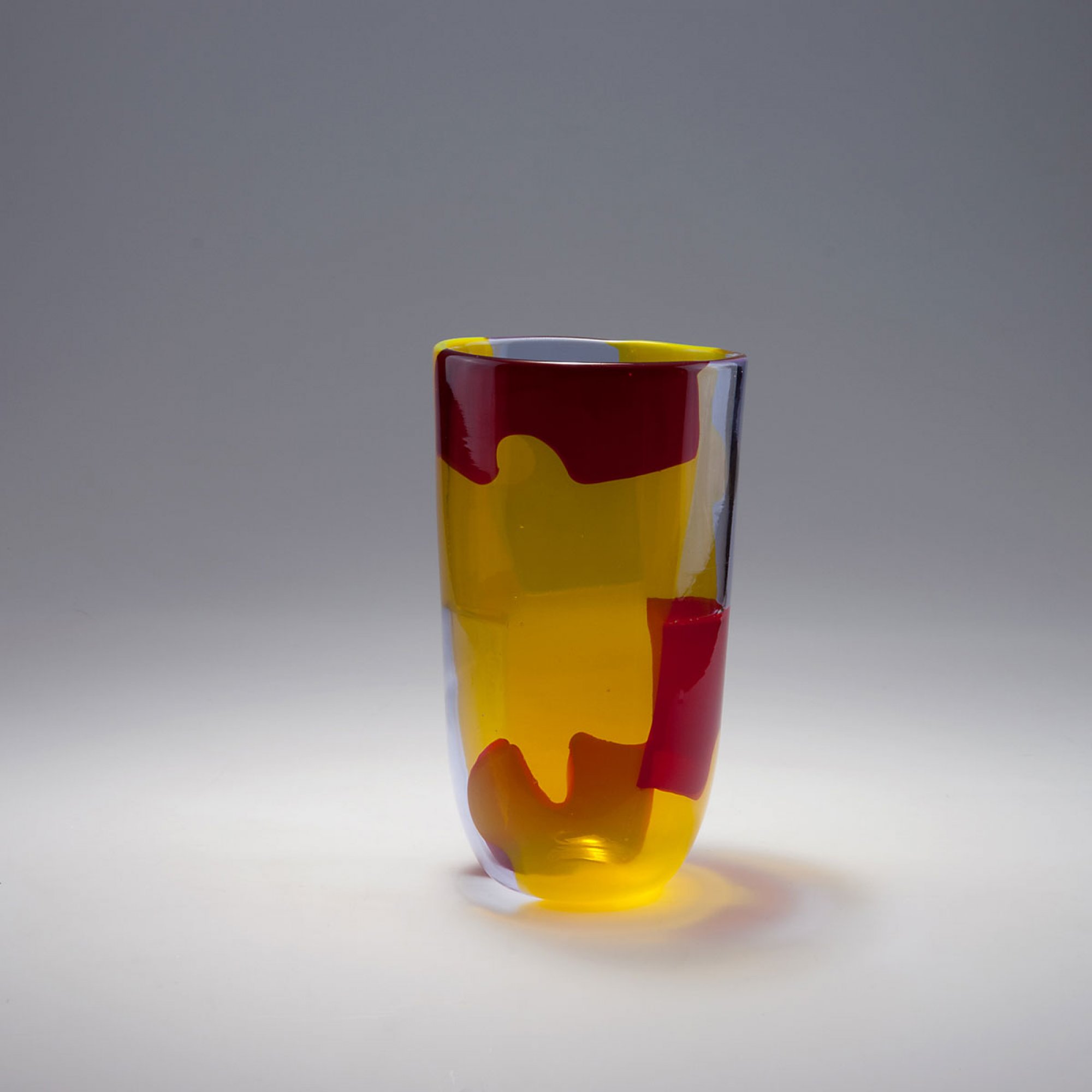 Becherform. H. 28,3 cm. Ausführung: Fratelli Toso. Miteinander verschmolzene, schachbrettartig angelegte Plättchen in Form von Puzzlestücken verzahnt, in Rot, Farblos und Gelb. Papier-Klebeetikett des Herstellers am Boden mit handschriftlicher Bez.: PUZZLE.