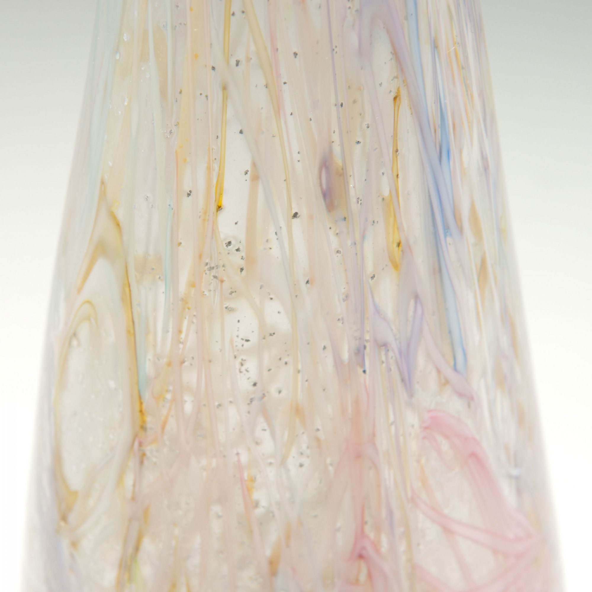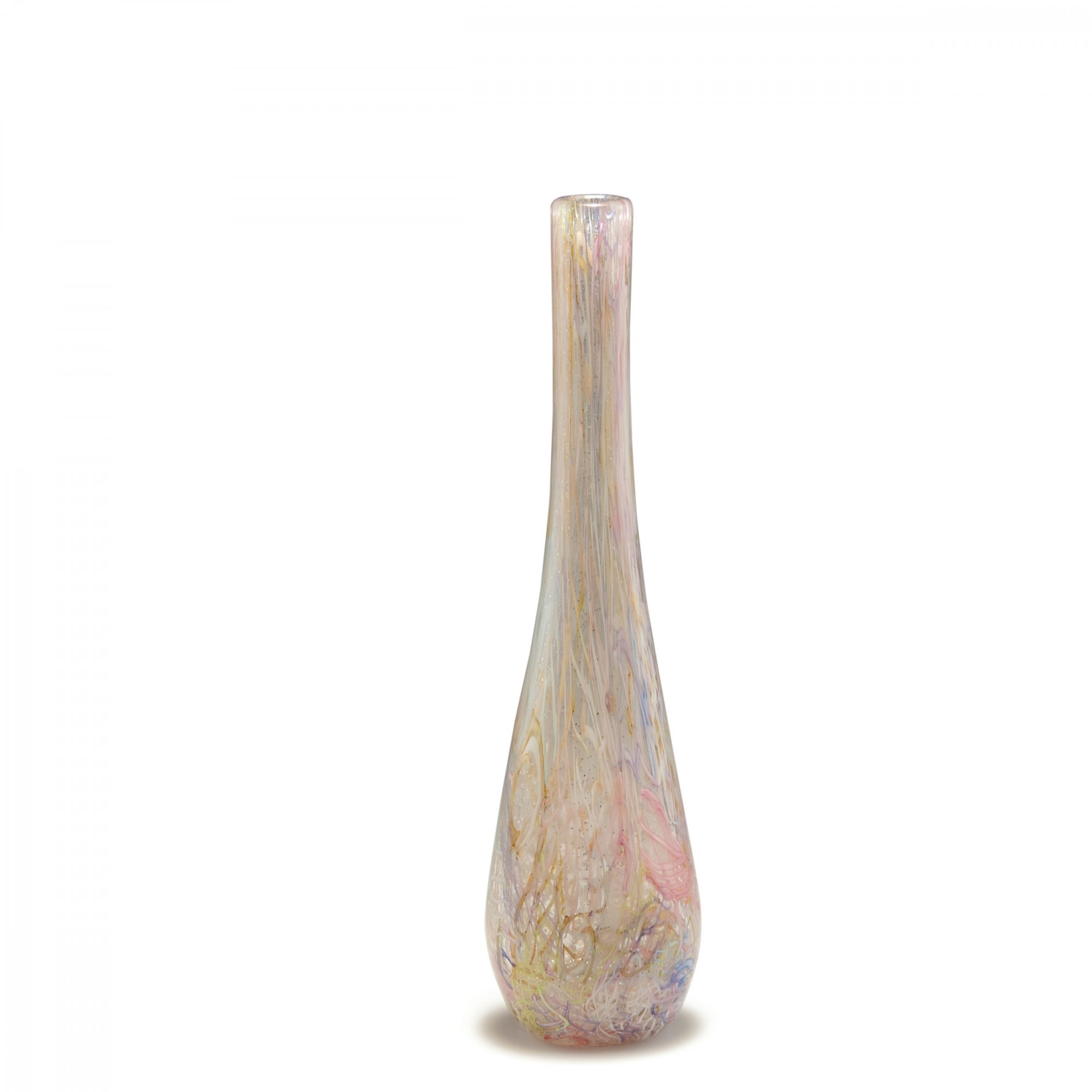 H. 36,6 cm. Dickwandiges Überfangglas, farblos und milchigweiß mit vielfarbigen Fadeneinlagen und zersprengter Silberfolie.