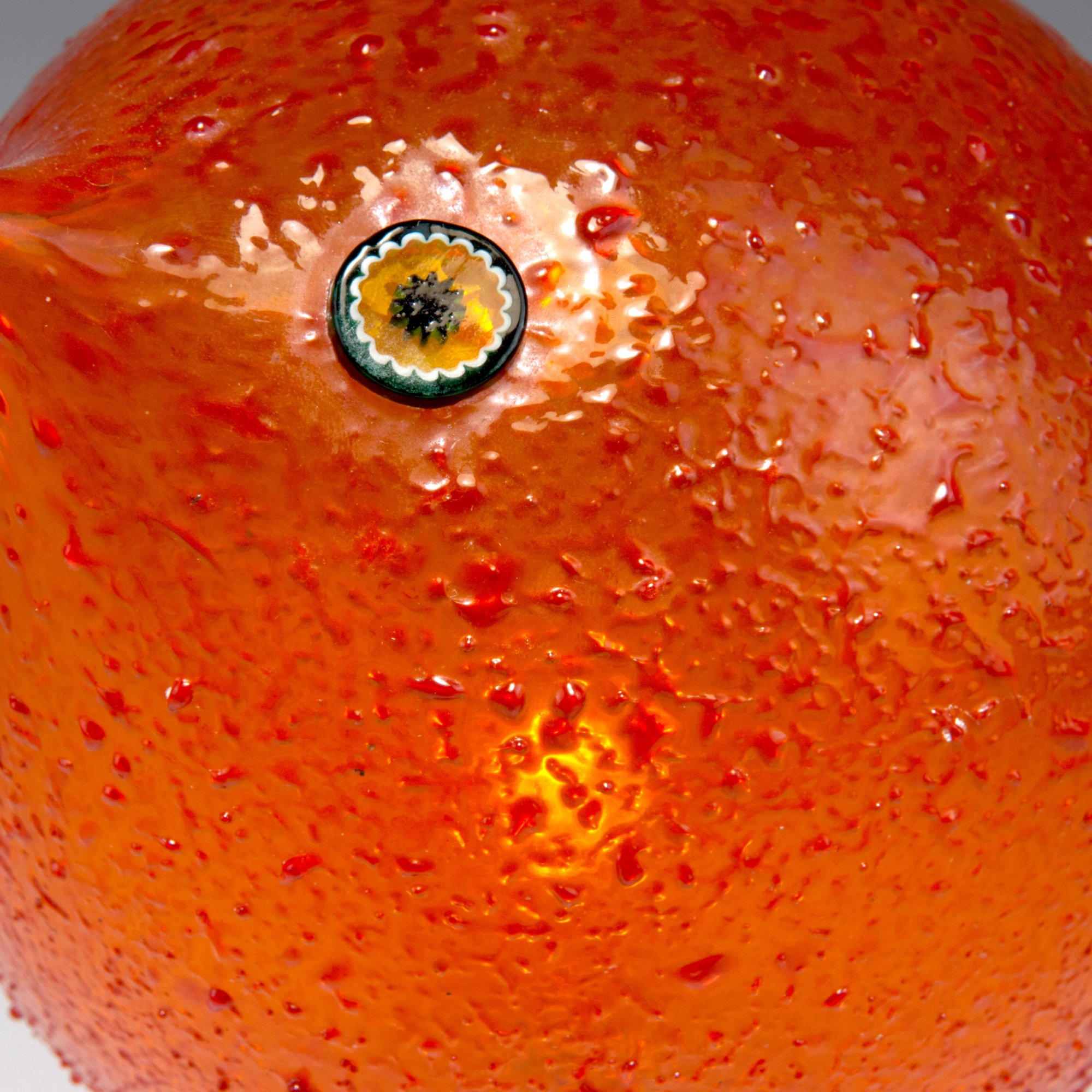 H. 21,5 cm. Ausführung: Vetreria Vistosi. Glas, farblos und orangerot mit Kröselaufschmelzungen, runde Murrine als Augen; Beine aus gehämmertem Kupferdraht.