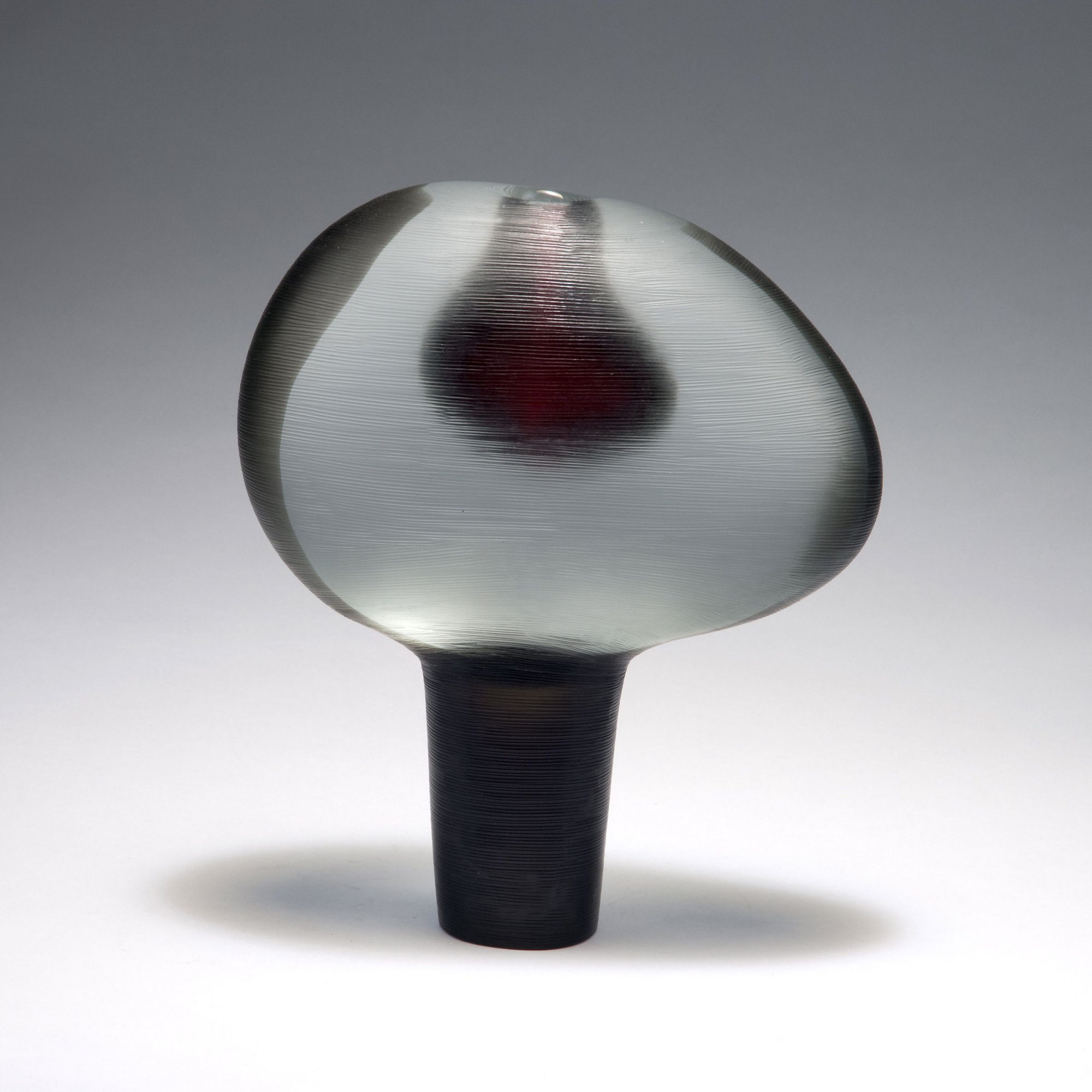 Auf runder Standfläche zylindrischer Fuß, eiförmiger, beidseitig abgeflachter Gefäßkörper mit kleiner Lochöffnung. H. 26,8 cm. Ausführung: Vetreria Alfredo Barbini. Überfangglas farblos, partiell grau, im Bereich des Hohlkörpers rot unterfangen. Oberfläche mit feinem 'Inciso'-Kerbschnitt. Unbez.