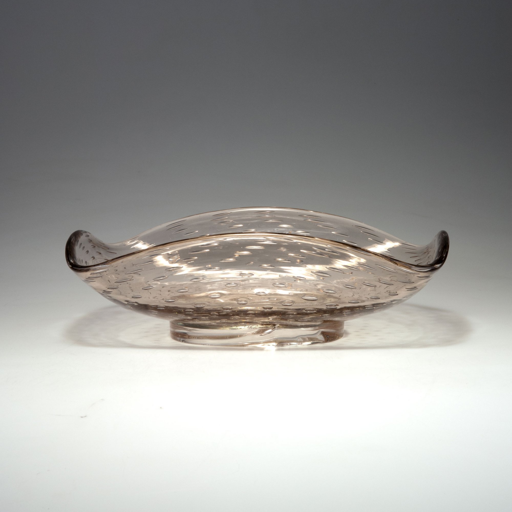 Querrechteckige Form auf ovalem Standring mit vierfach bogig aufgestelltem Rand. H. 11,5 cm, 37 x 25,5 cm. Ausführung: Venini & C. Überfangglas, farblos und bernsteinfarben mit regelmäßig eingestochenen Luftblasen. Auf dem Standring bez.: venini murano (Ätzstempel).