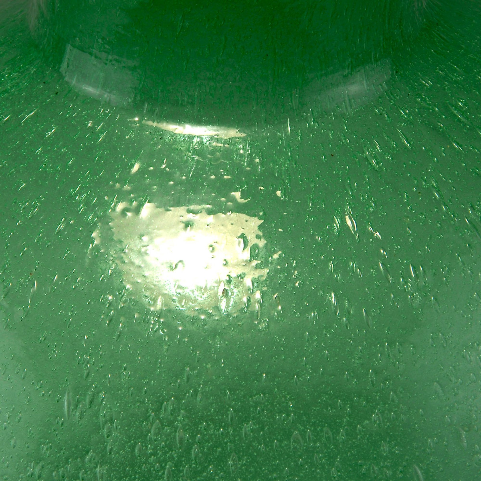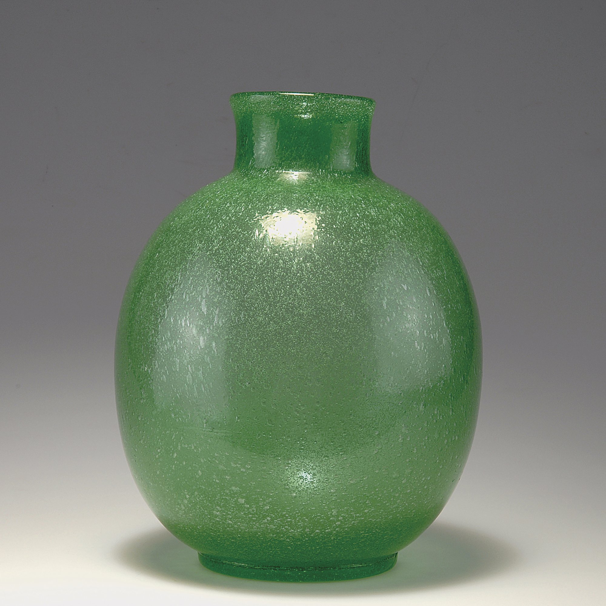 Kugelige Gefäßform, zylindrischer, zur Mündung leicht ausschwingender Hals, Standring. H. 25,7 cm. Ausführung: Venini & C. Smaragdgrün getöntes Glas mit dichten, schaumartigen Luftblasen. Bez.: venini murano E (Ätzstempel).