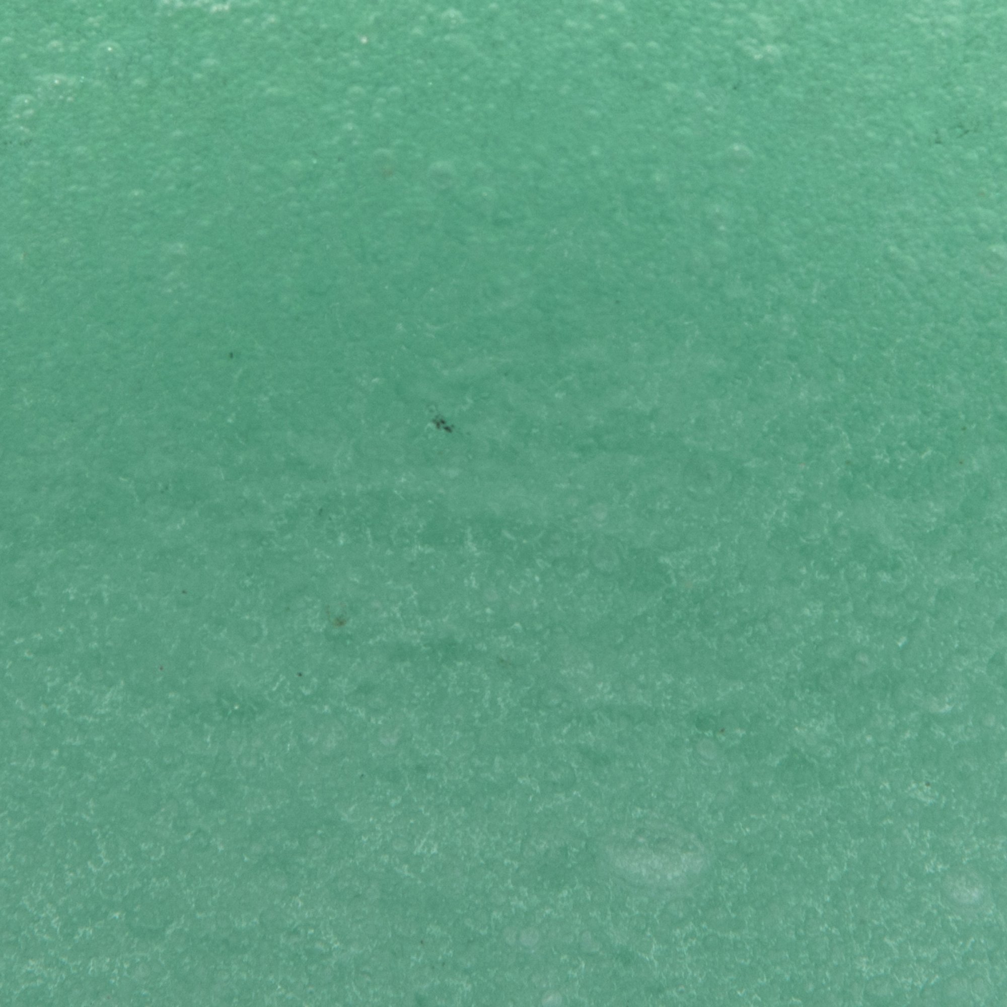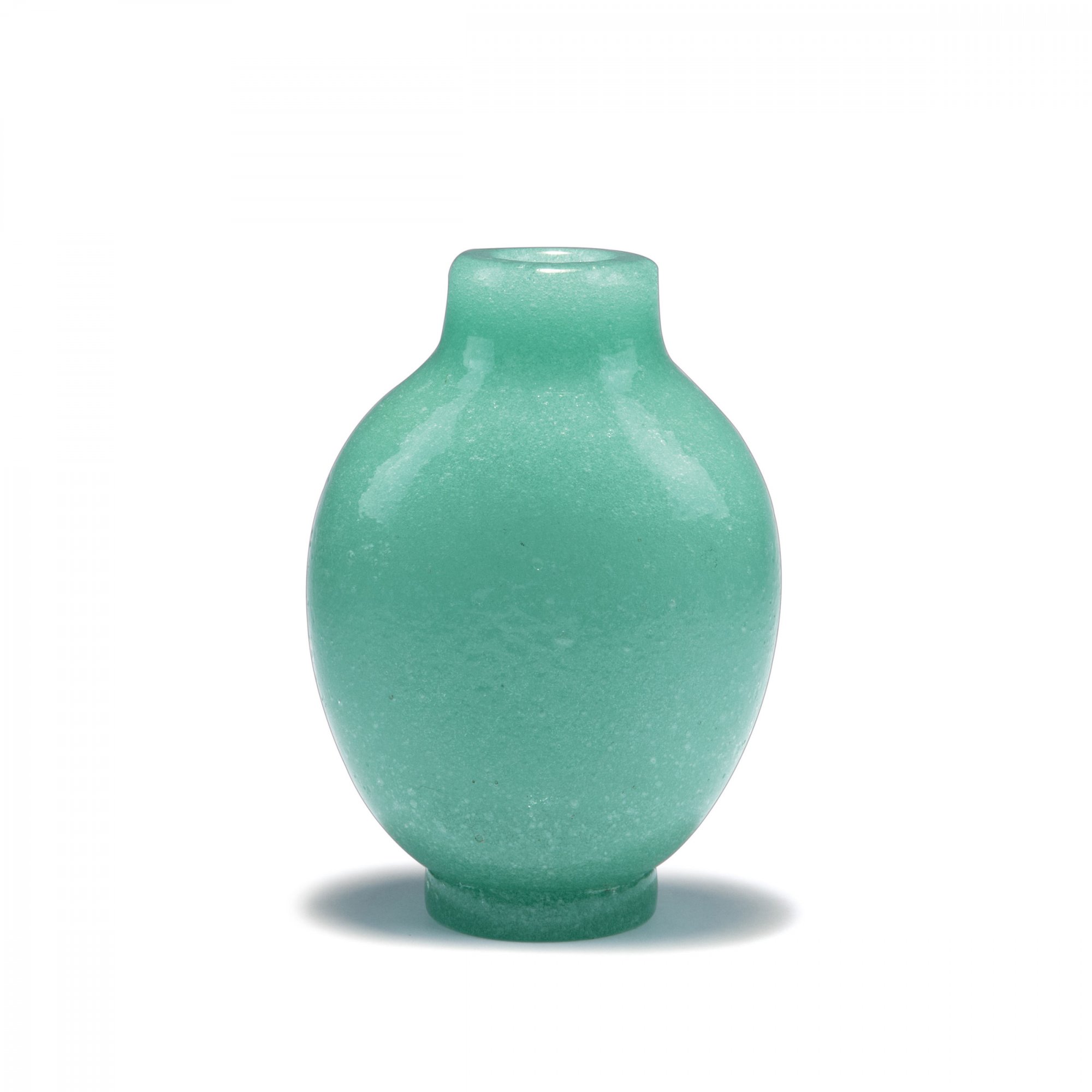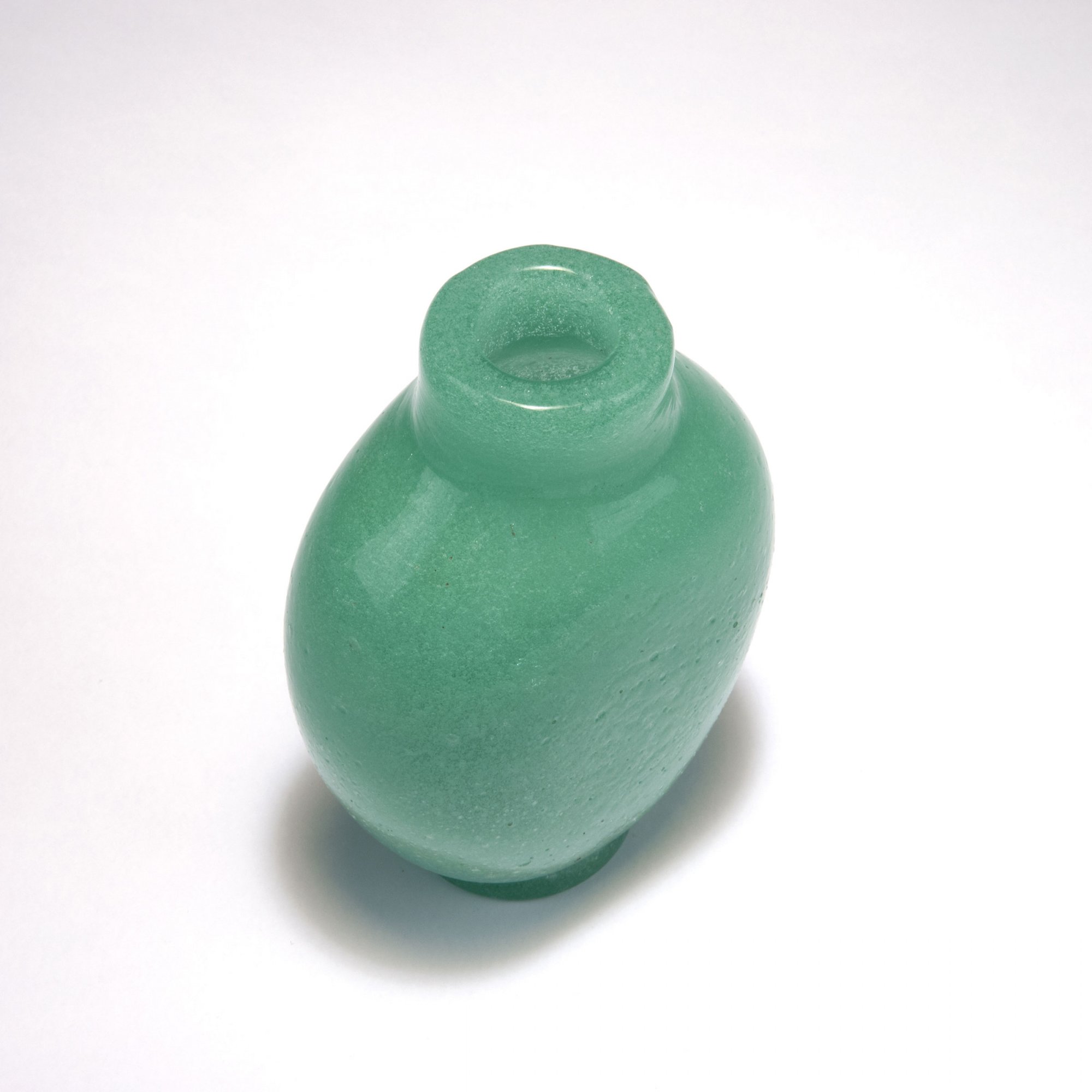 Auf rundem, zylindrischen Stand zweiseitig abgeflachte Ovalform mit abgesetztem Zylinderhals. H. 19 cm. Ausführung: Venini & C. Stark blasiges grünes Glas. Am Boden bez.: venini murano (Ätzstempel), rundes Papier-Klebeetikett des Herstellers am Boden.