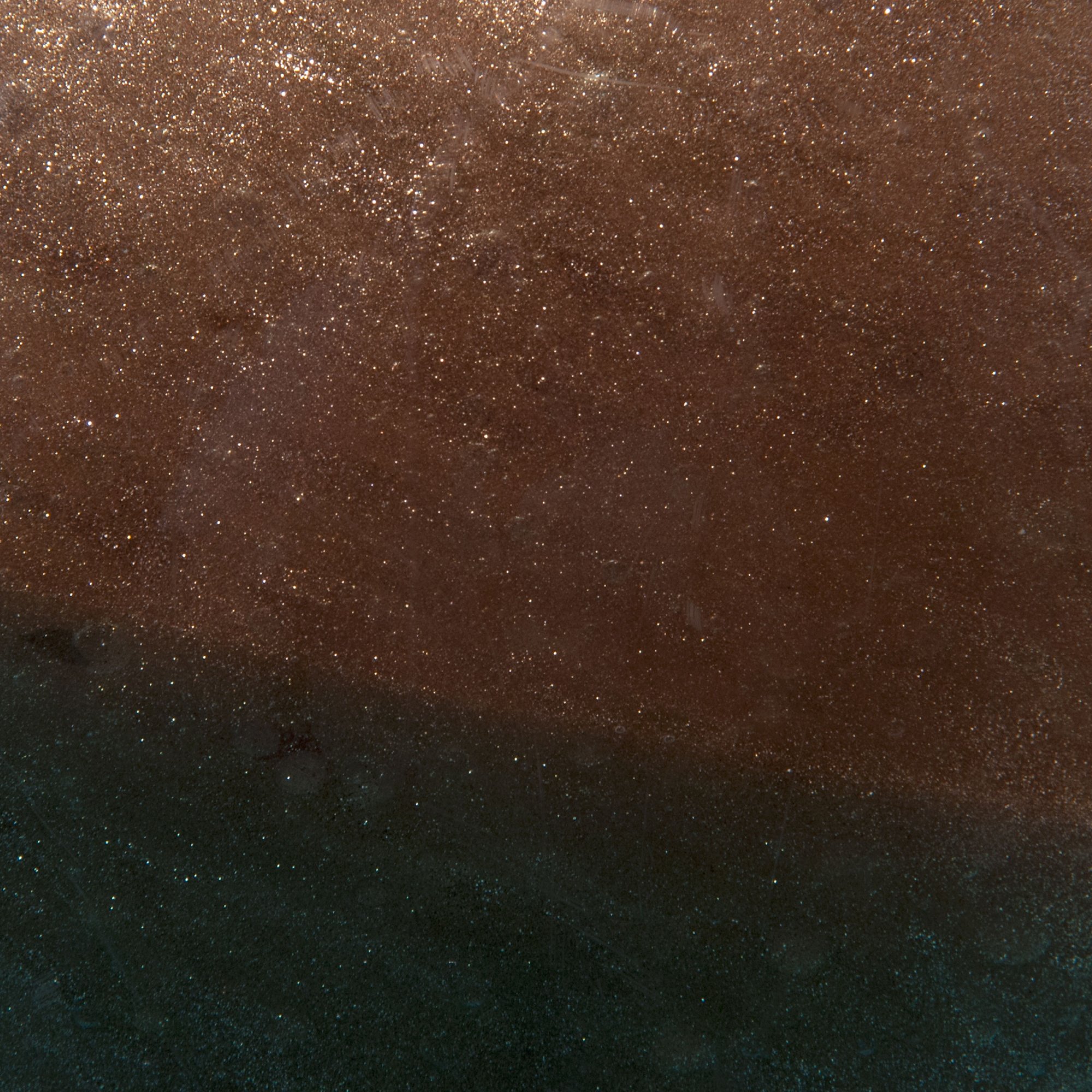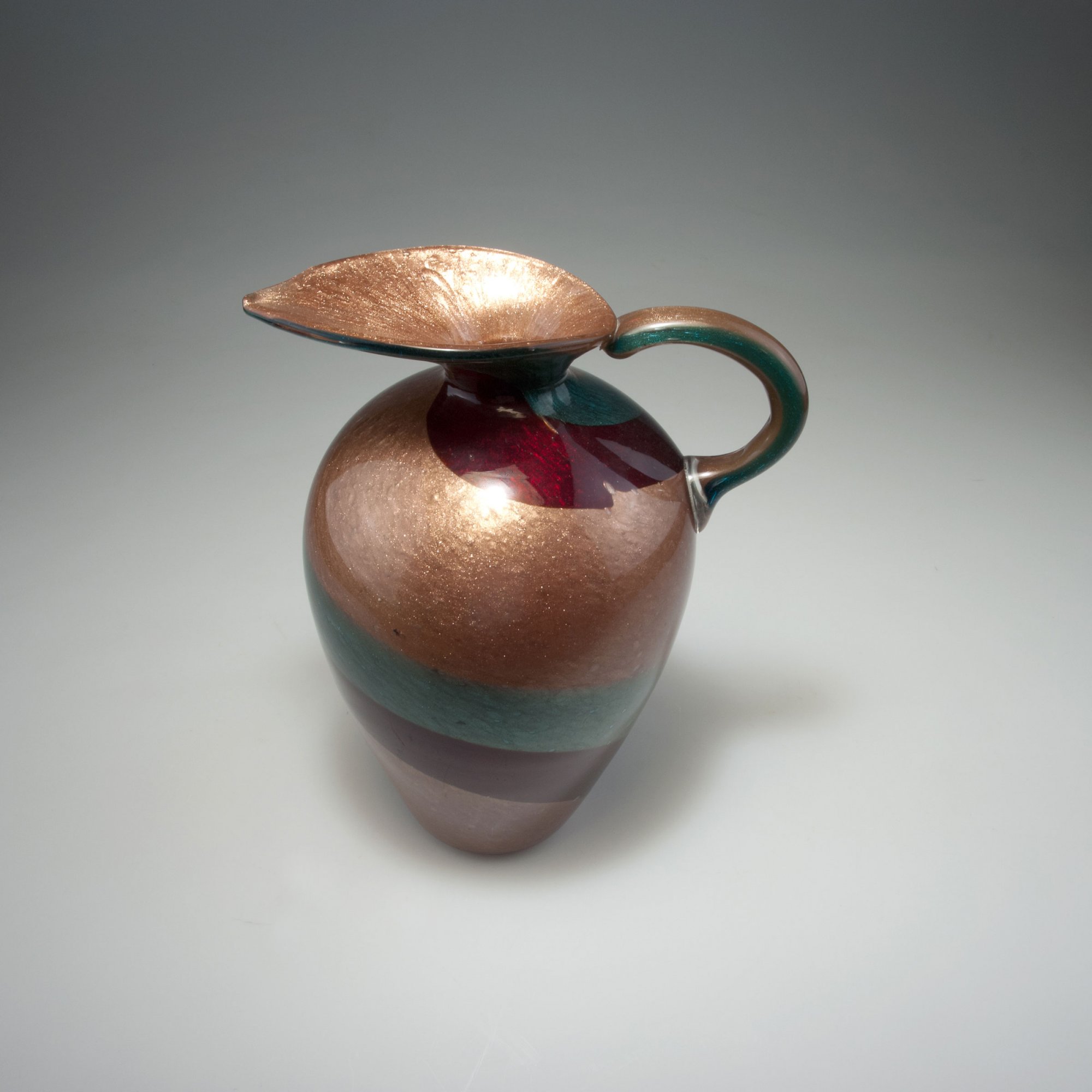 Modell-Nr. 5346. Zur Schulter leicht gewölbt sich erweiternder Korpus mit eingeschnürtem Hals und flachem, spitz ausgezogenem Ausguss; Bogenhenkel. H. 29,5 cm. Ausführung: Aureliano Toso. Überfangglas, farblos mit eingeschmolzenen, spiralig umlaufenden Bändern in Azurblau und Kirschrot über flächendeckender Schicht aus Aventuringlas.
