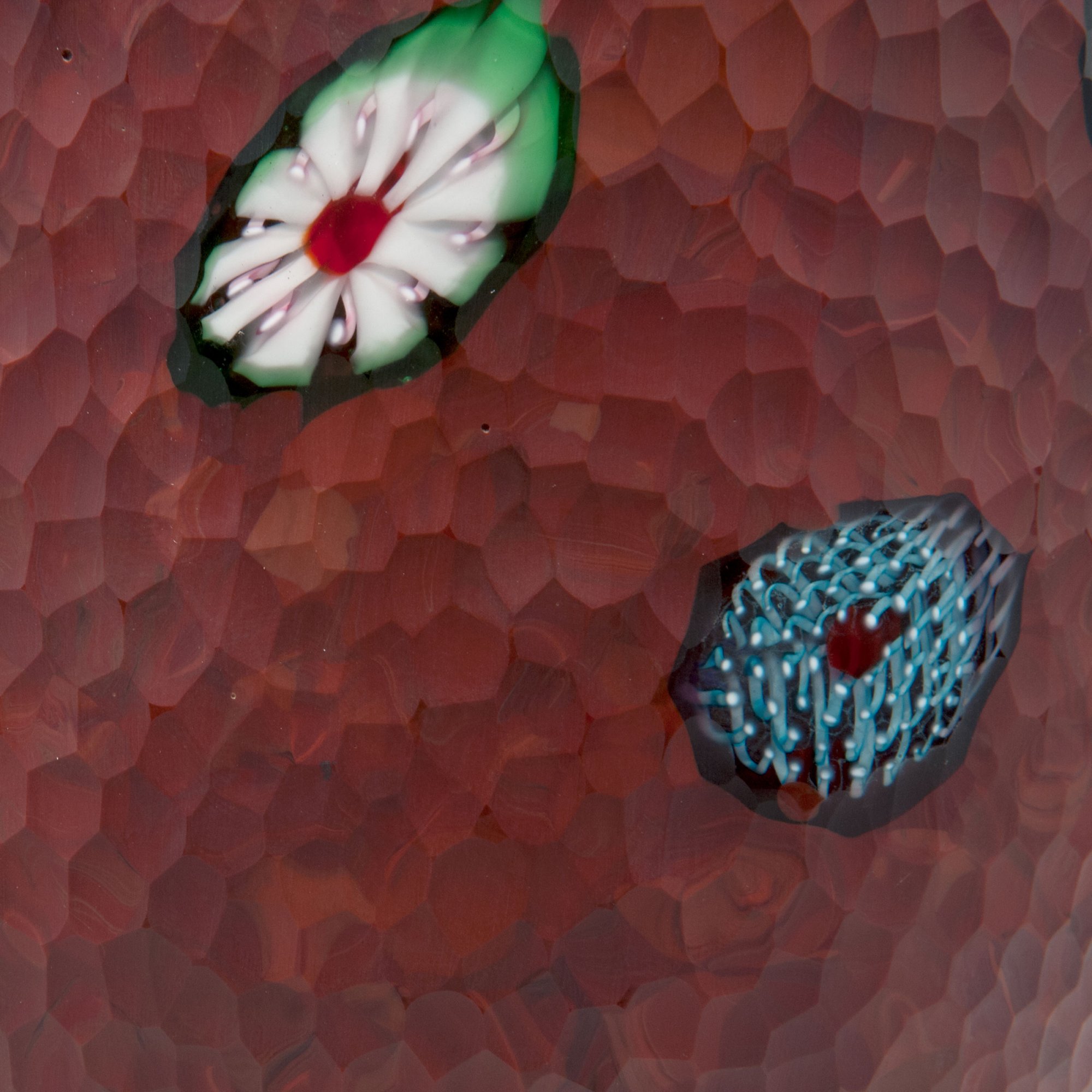 Schlanke Balusterform. H. 31,2 cm. Ausführung Fratelli Toso. Vornehmlich rostrote, miteinander verschmolzene Murrine, dazwischen vielfarbige große Murrine, der Bereich außerhalb der großen vielfarbigen Murrinen mit hammerschlagartigem sog. 'Battuto'-Schliff versehen.