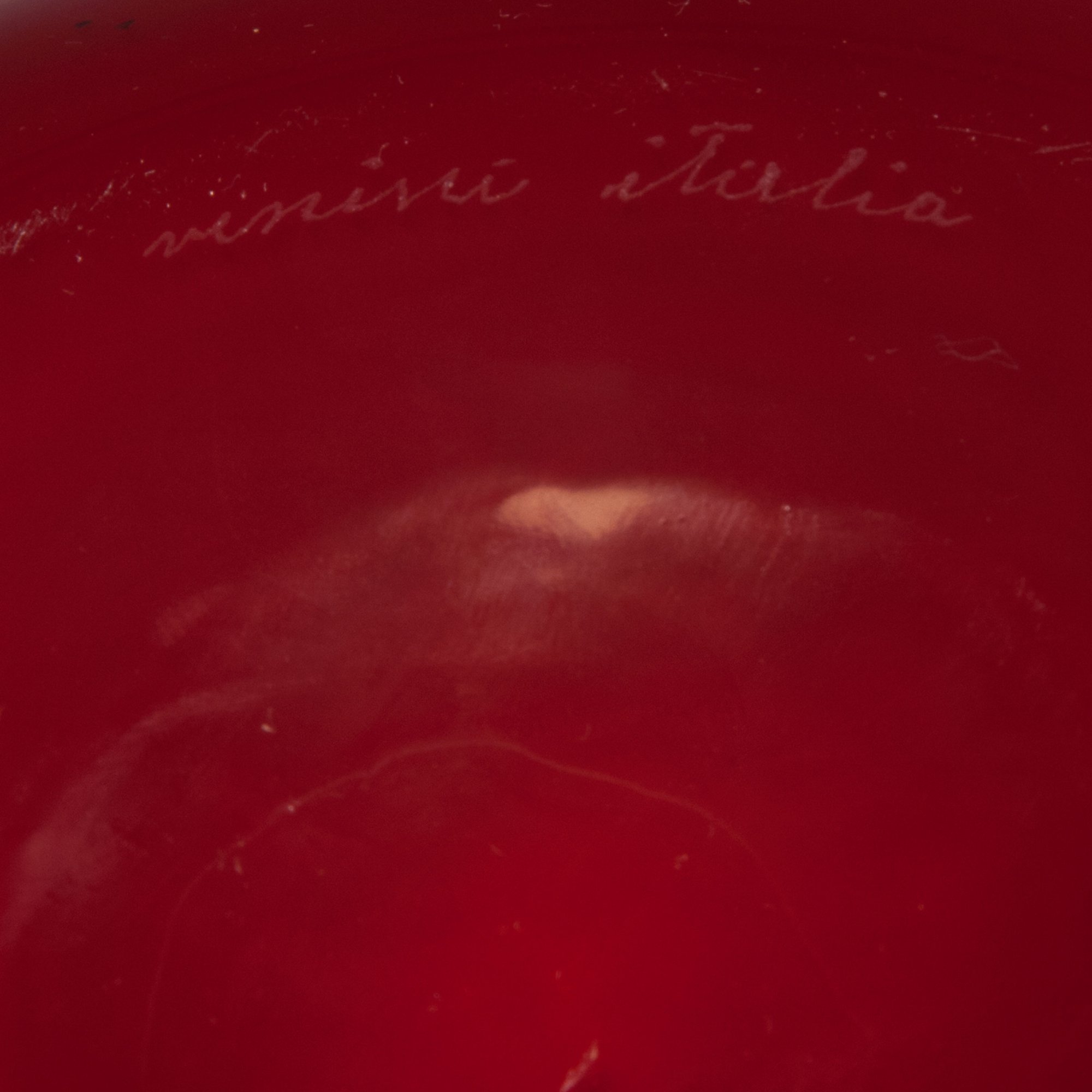 Mehrfach gefaltete Wandung. H. 27,7 cm. Ausführung: Venini & C. Überfangglas, farblos, weiß und rot. Am Boden bez.: venini italia (graviert).