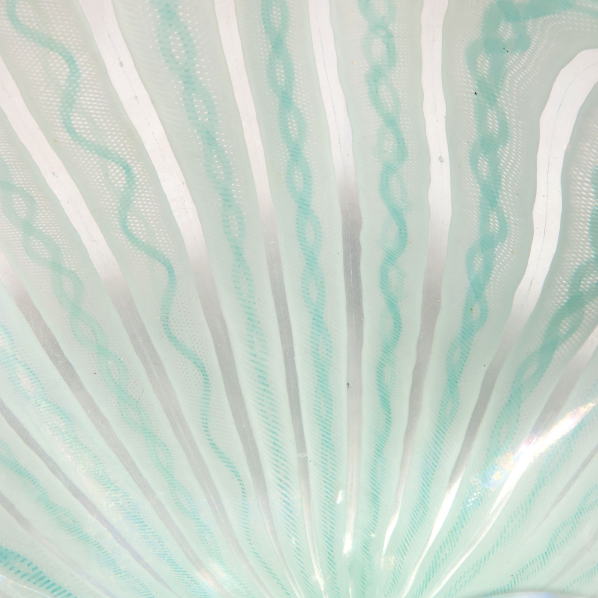 H. 12,8 cm. Ausführung: Venini & C. Farbloses Glas mit Spiralbändern in Weiß, in denen hellgrüne Spiralbänder ('Zanfirico') verlaufen. Am Boden bez.: venini murano MADE IN ITALY (Ätzstempel).