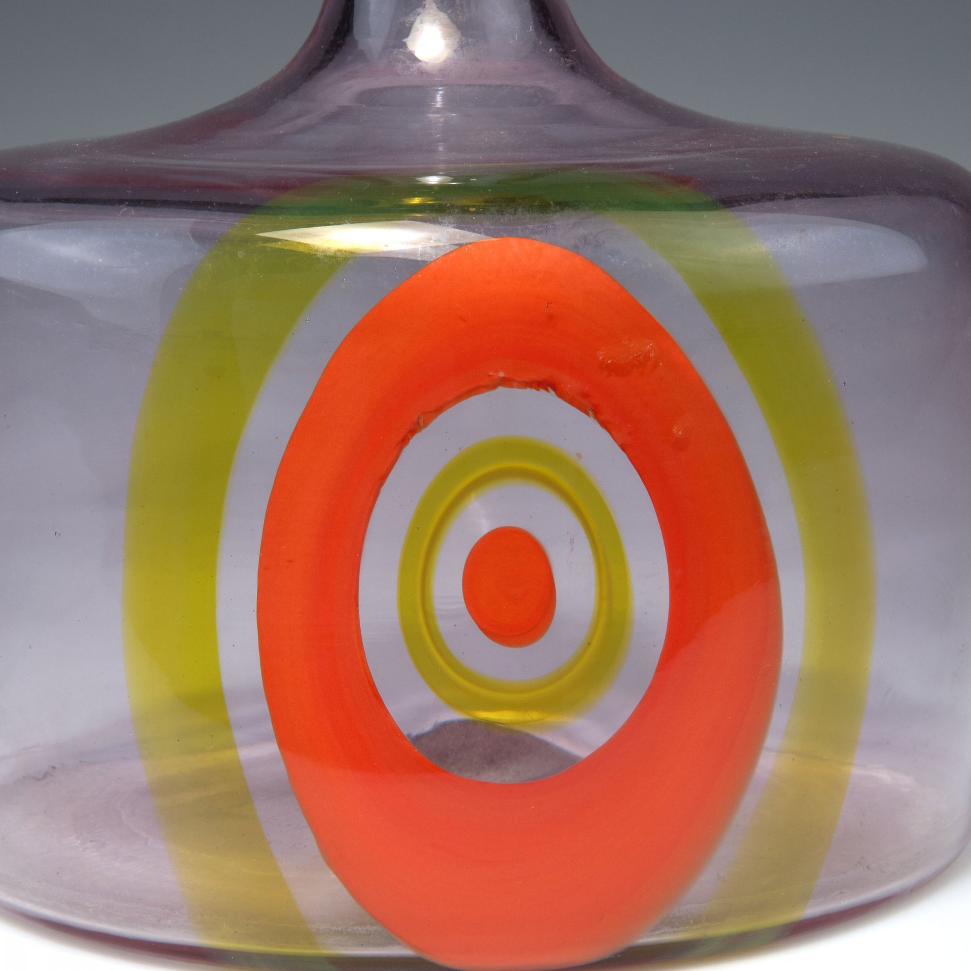 H. 21 cm. Ausführung: La Murrina. Überfangglas, farblos und hellviolett, eingeschmolzene große Murrine aus gelbem und rotem Glas.