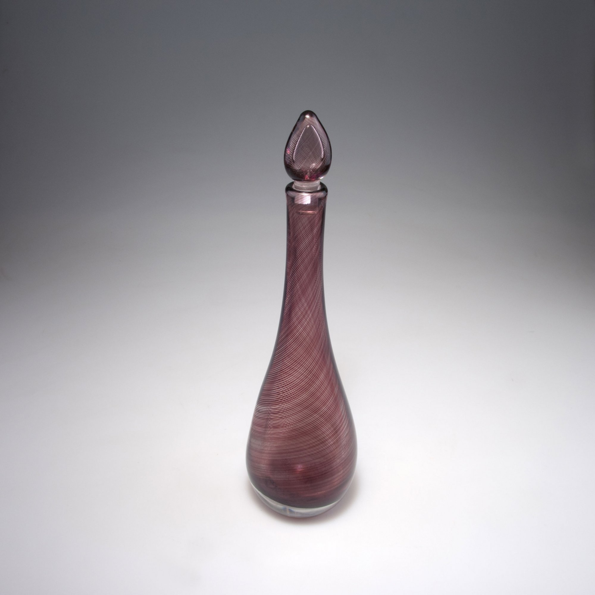 Zweiseitig abgeflachte Tropfenform mit Stopfen. H. 42,3 cm. Ausführung: Venini & C. Überfangglas, farblos mit dunkelviolettem Spiralfaden. Am Boden bez.: venini murano ITALY (runder Ätzstempel).