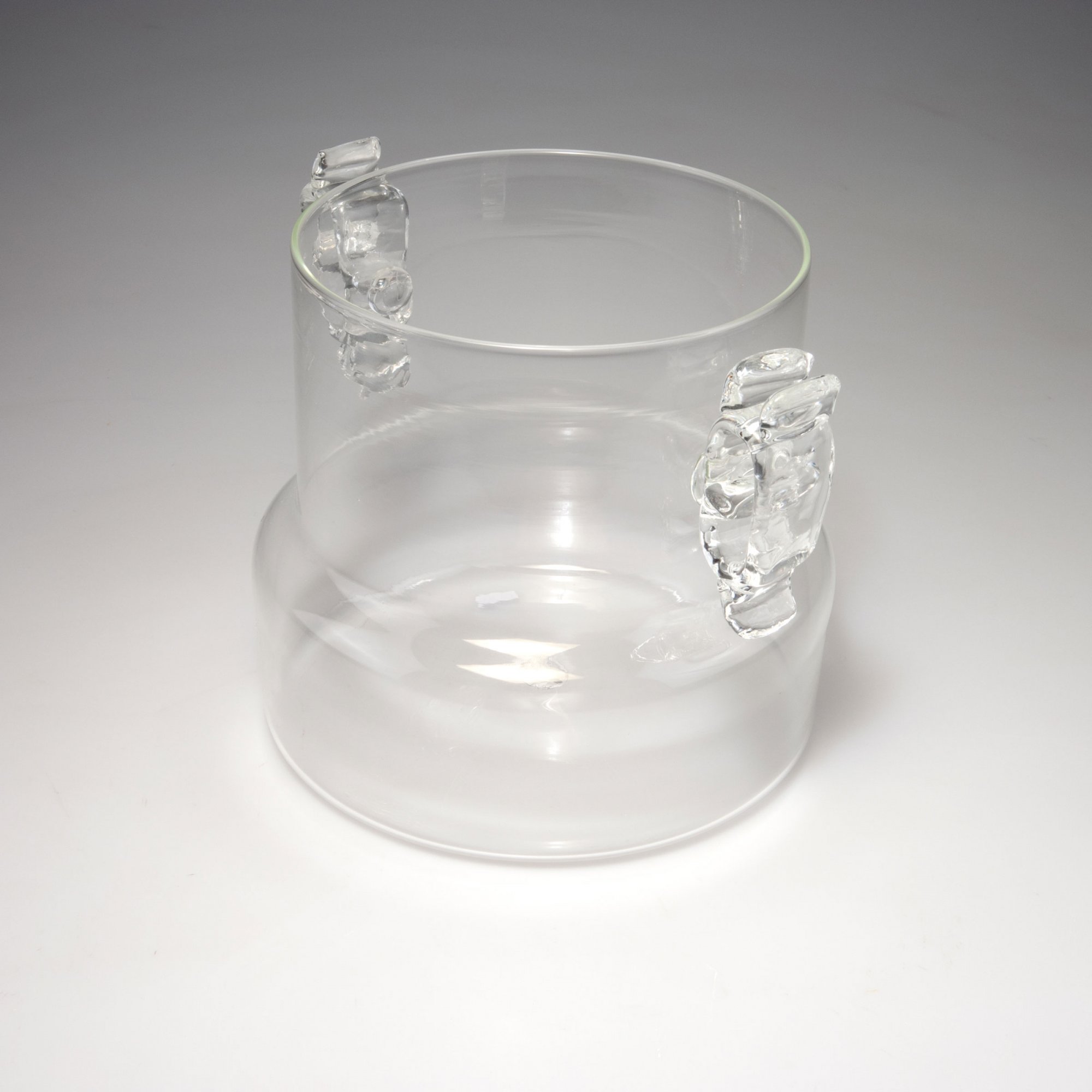 Zylindrisch mit zwei Handhaben. H. 20,6 cm. Ausführung: Fratelli Toso. Farbloses Glas.