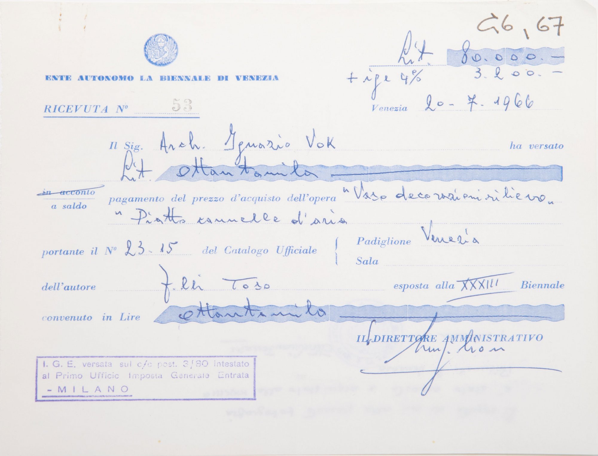 Diese Vase wurde auf der XXXIII. Biennale in Venedig 1966 ausgestellt und erworben. Die Original-Rechnung und eine zeitgenössische Fotoexpertise liegen vor und werden dem Käufer ausgehändigt. Vgl. Marina Barovier, Rosa Barovier Mentasti, Attilia Dorigato, Il Vetro di Murano alle Biennali 1895-1972, Mailand 1995, S. 210, Nr. 167.
