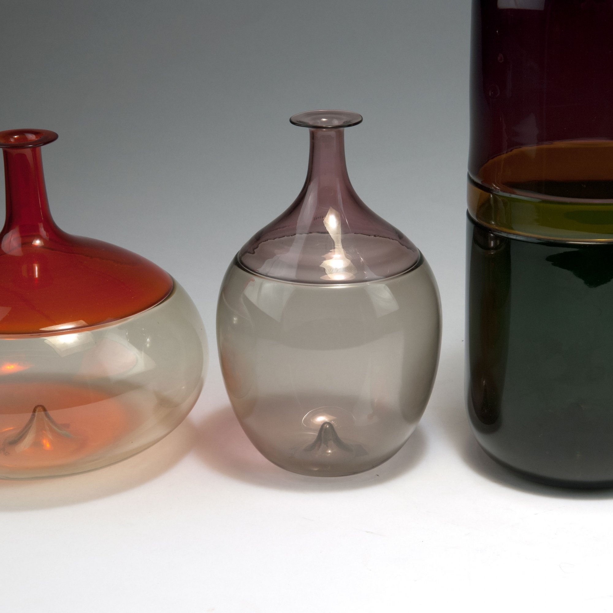 H. 19,8-40,3 cm. Ausführung: Venini & C., 1992, 2008, 2009, 2007. In sog. 'Incalmo'-Technik miteinander verschmolzene Glasmassen in Hellbernsteinfarben und Rot, Hellgrau und Violett, Hellbernsteinfarben und Grün, Aquamarin und Grau bzw. Grün, Gelb und Dunkelviolett. Am Boden bez.: venini tw 92, venini tw 2008, venini tw 2009, venini tw 92 oder venini tw 2007 (graviert); rundes Kunststoff-Klebeetikett des Herstellers an jeder Wandung.
