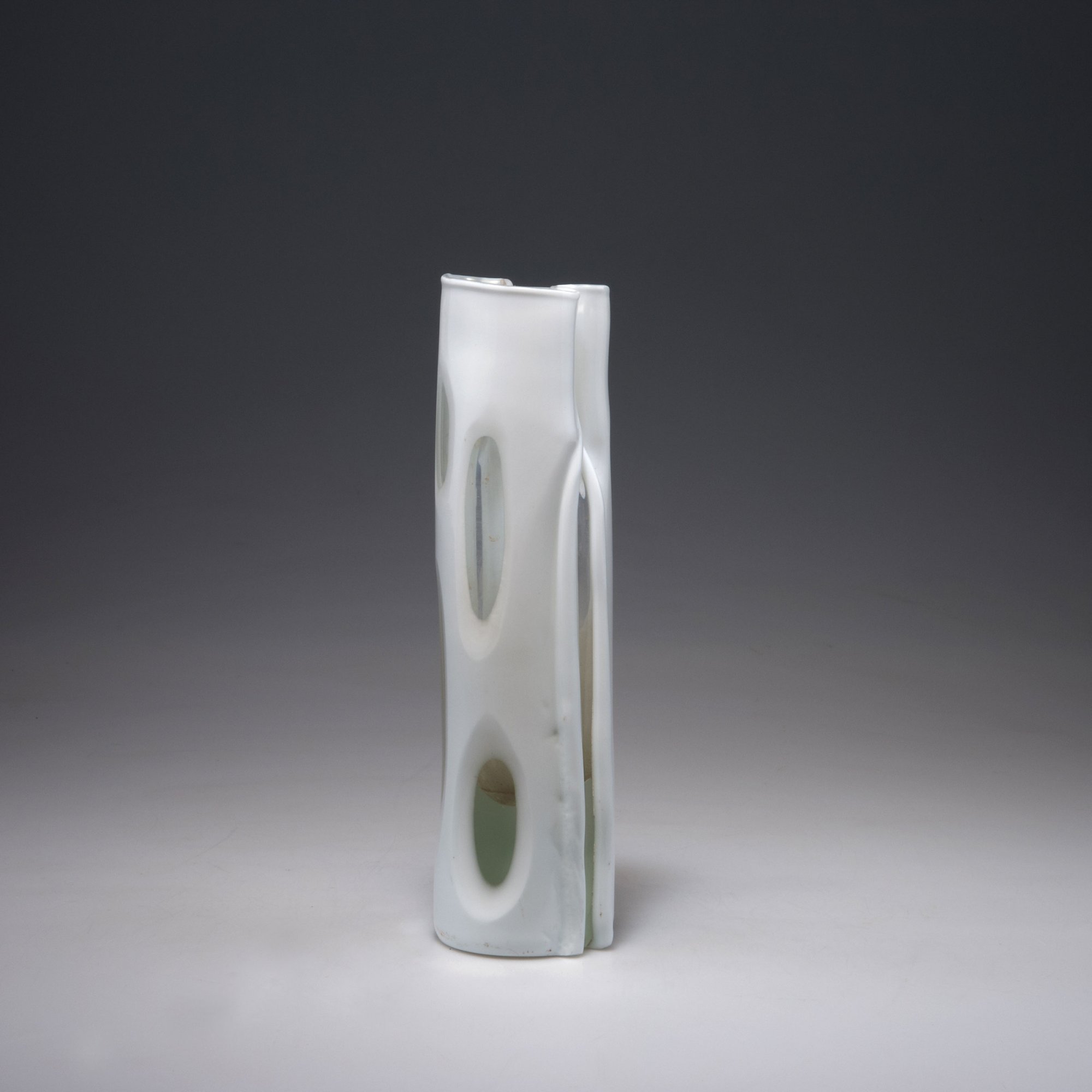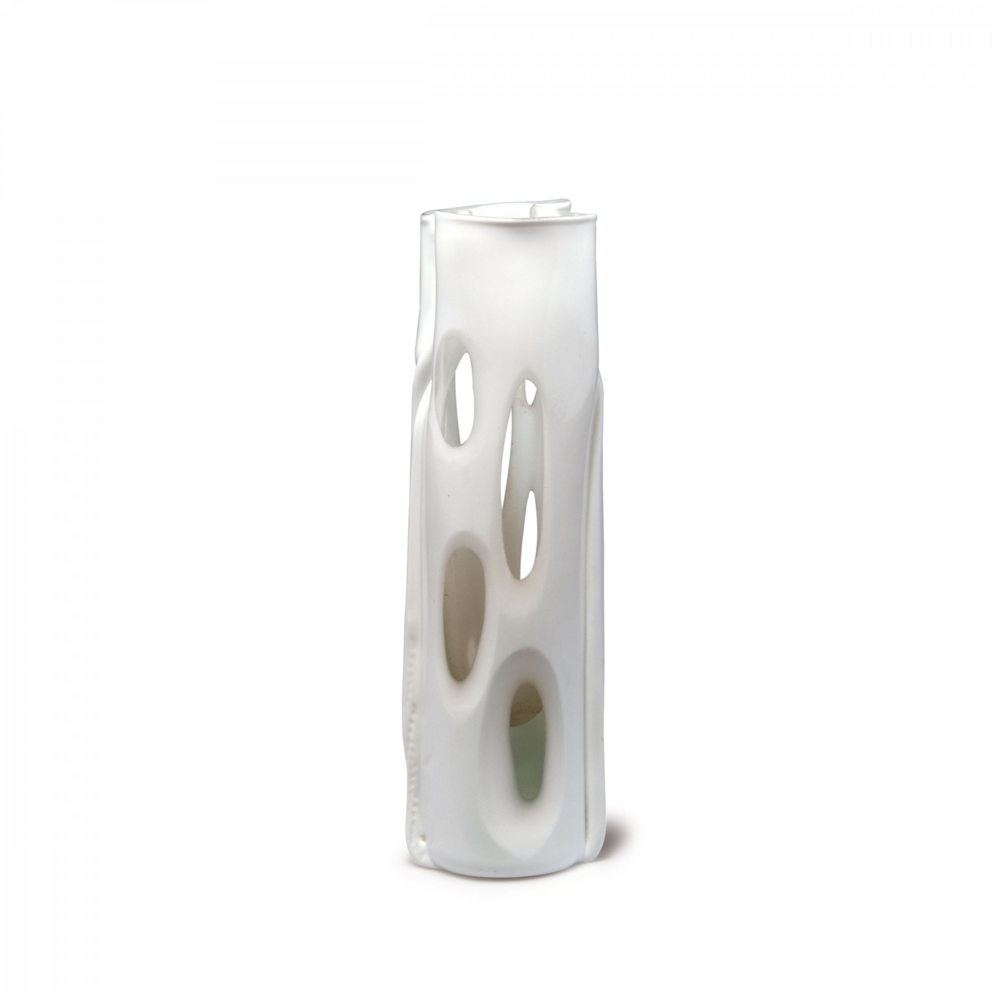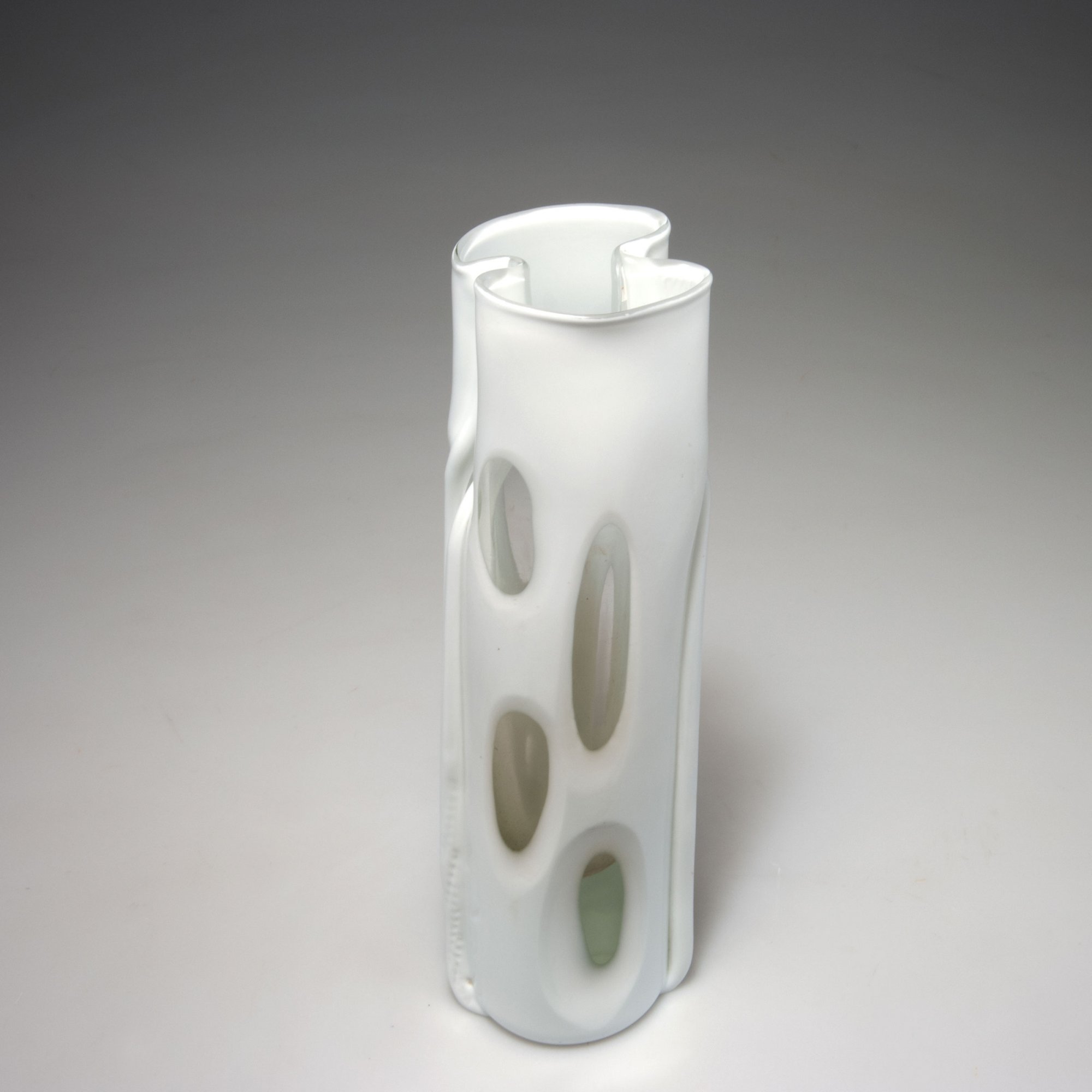 Auf rundlicher Standfläche zweiseitig angebrachte Stäbe, im oberen Bereich in die Wandung gedrückt. H. 28 cm. Ausführung: Venini & C. Überfangglas, farblos und weiß, achtfach mit großflächigen, linsenartigen Kerbschliffen. Am Boden bez.: venini italia (graviert).