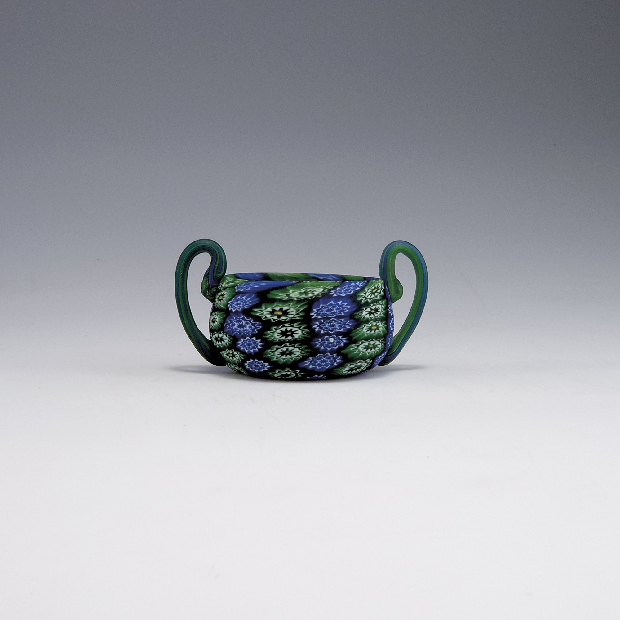 H. 5 cm, Dm. 6,8 cm. Farbloses Glas, in vertikalen Bändern aufgeschmolzene Blütenmurrine in Grün, Weiß, Gelb und Blau.