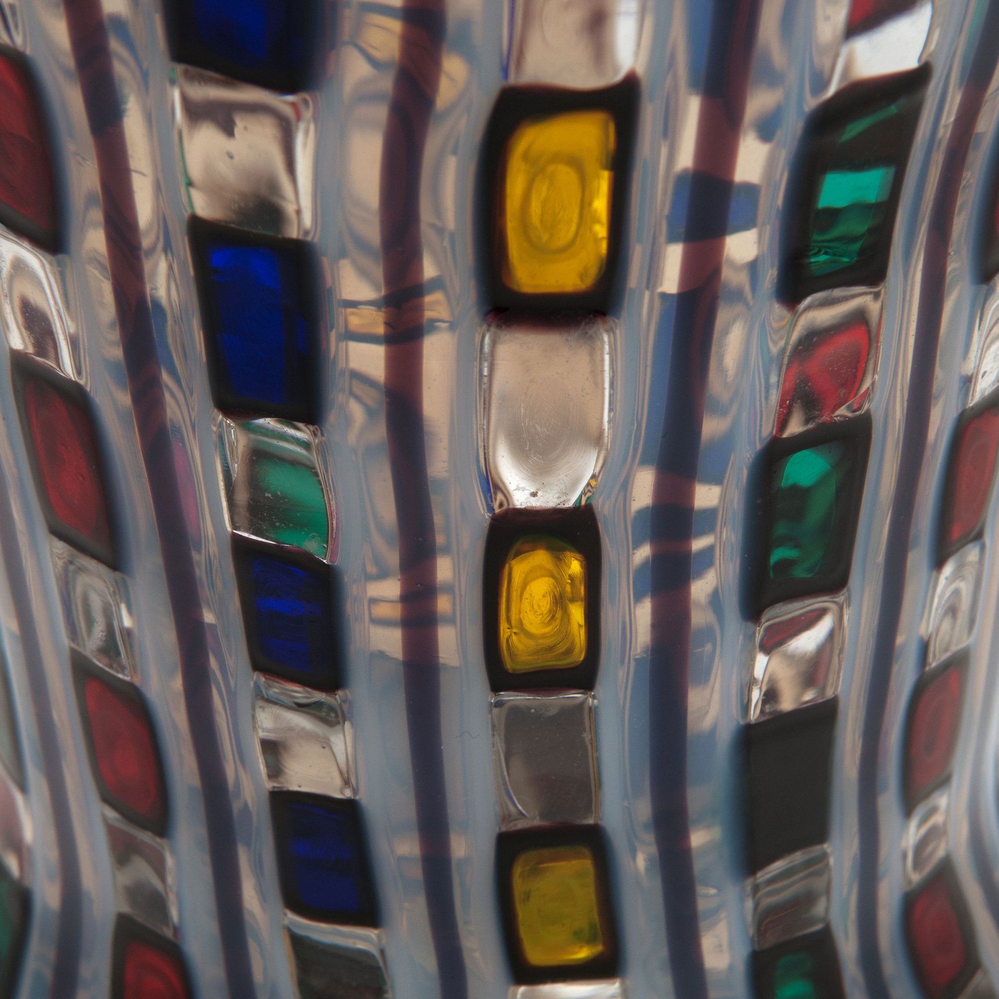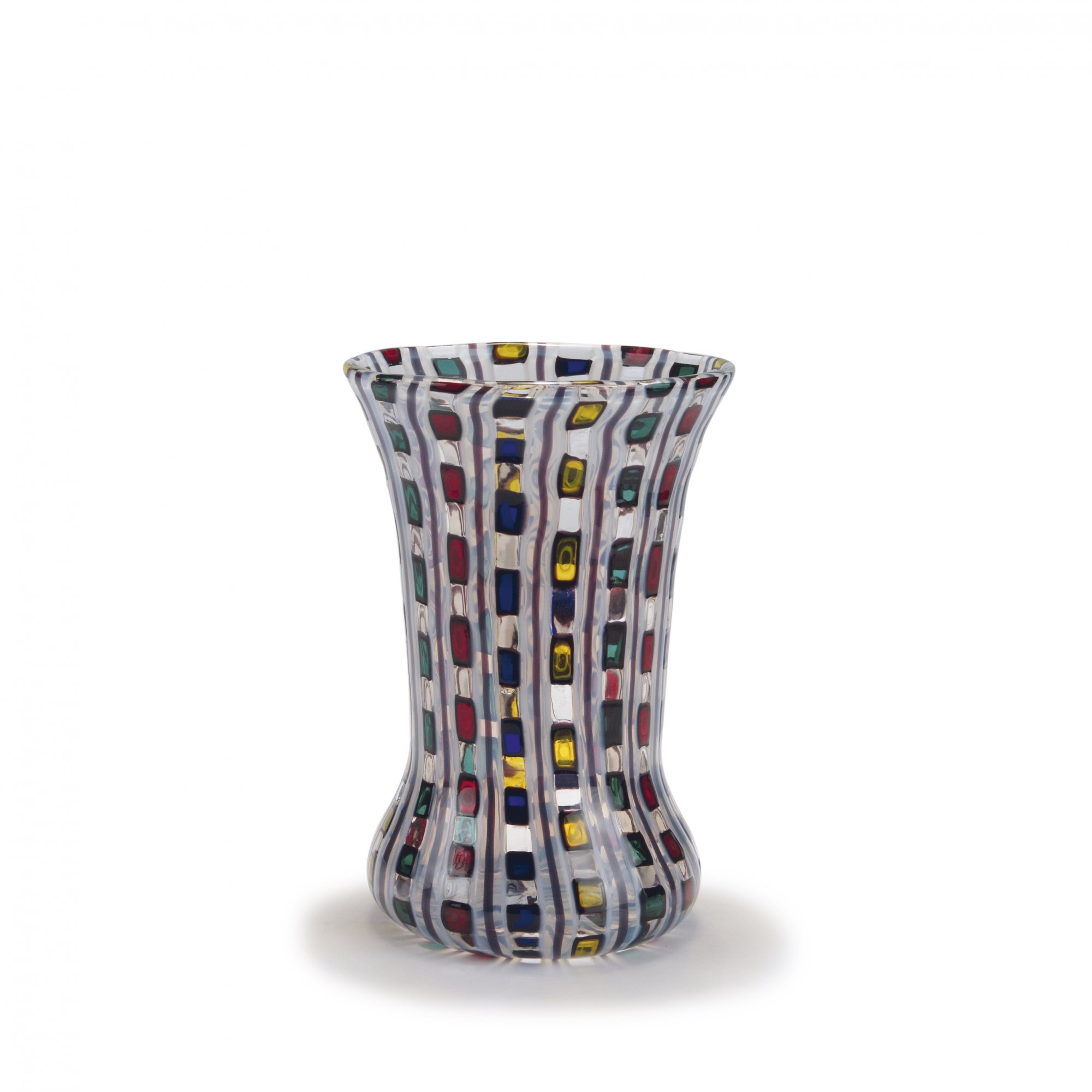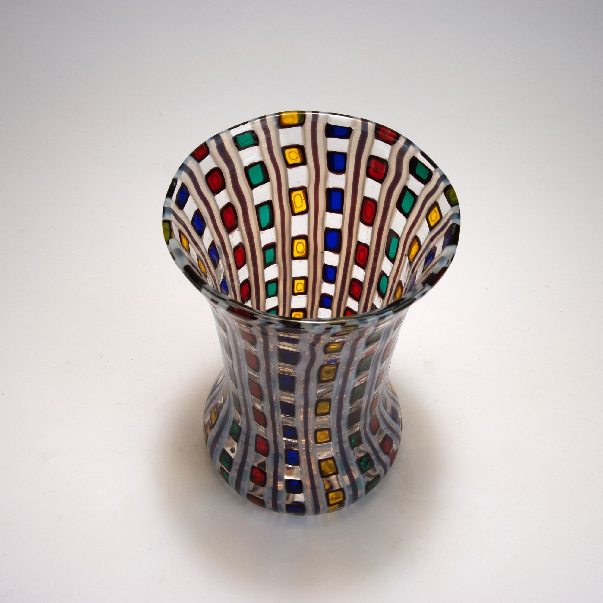 Glockenform zur Standzone leicht ausgebuchtet. H. 25,6 cm. Ausführung: Barovier & Toso. Farbloses Glas mit in vertikalen Reihen aufgeschmolzenen, dunkelviolett umrandeten Quadraten in Gelb, Blau, Rot und Grün, durch dunkelviolette, mit weiß umschmolzene Fäden gegliedert. Am Boden bez.: Ercole Barovier 12/6 1968 (diamantgerissen).