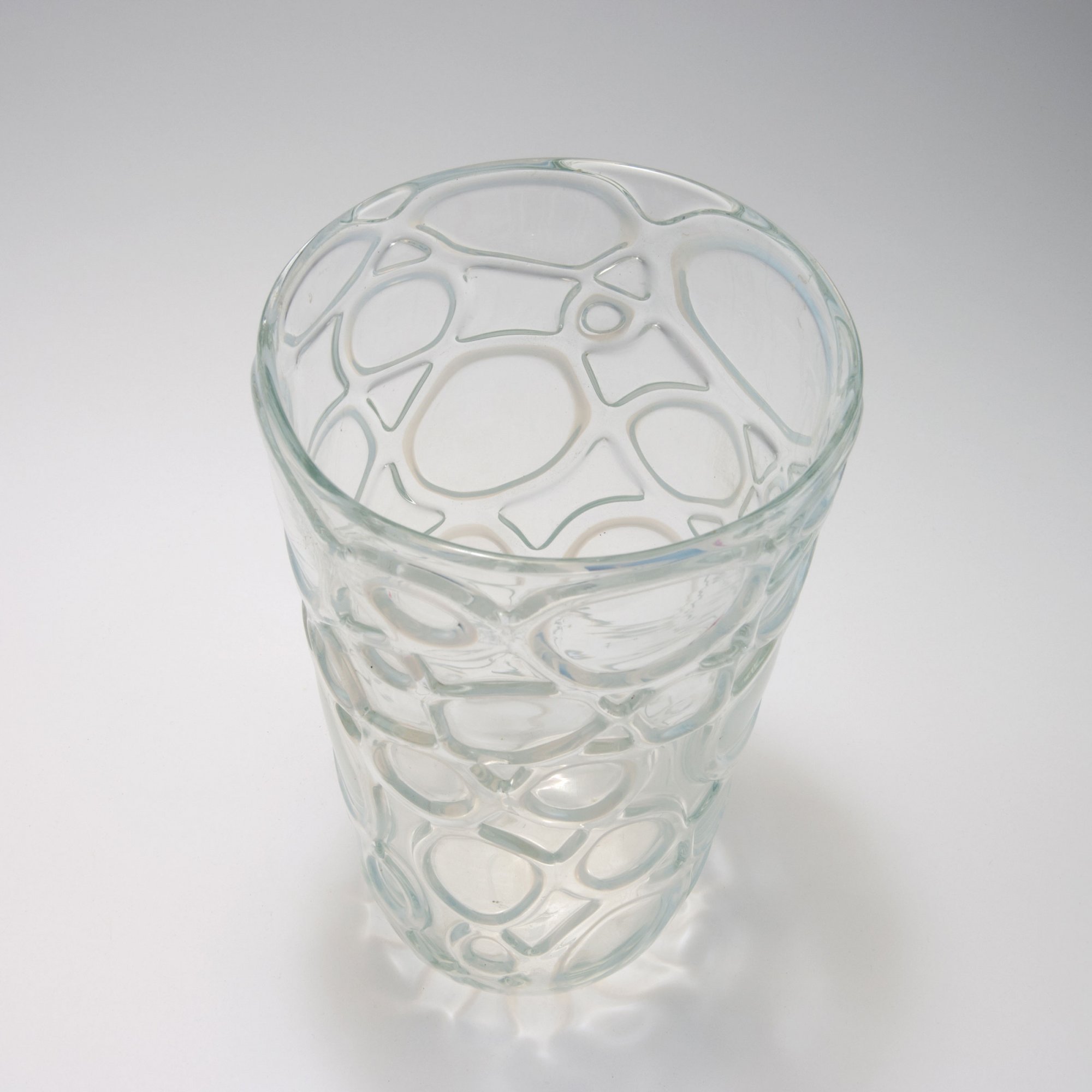 Sich leicht erweiternd. H. 27,2 cm. Ausführung: Barovier & Toso. Farbloses Glas mit Ringaufschmelzungen aus farblosem Glas mit opaleszentweißem Kern.