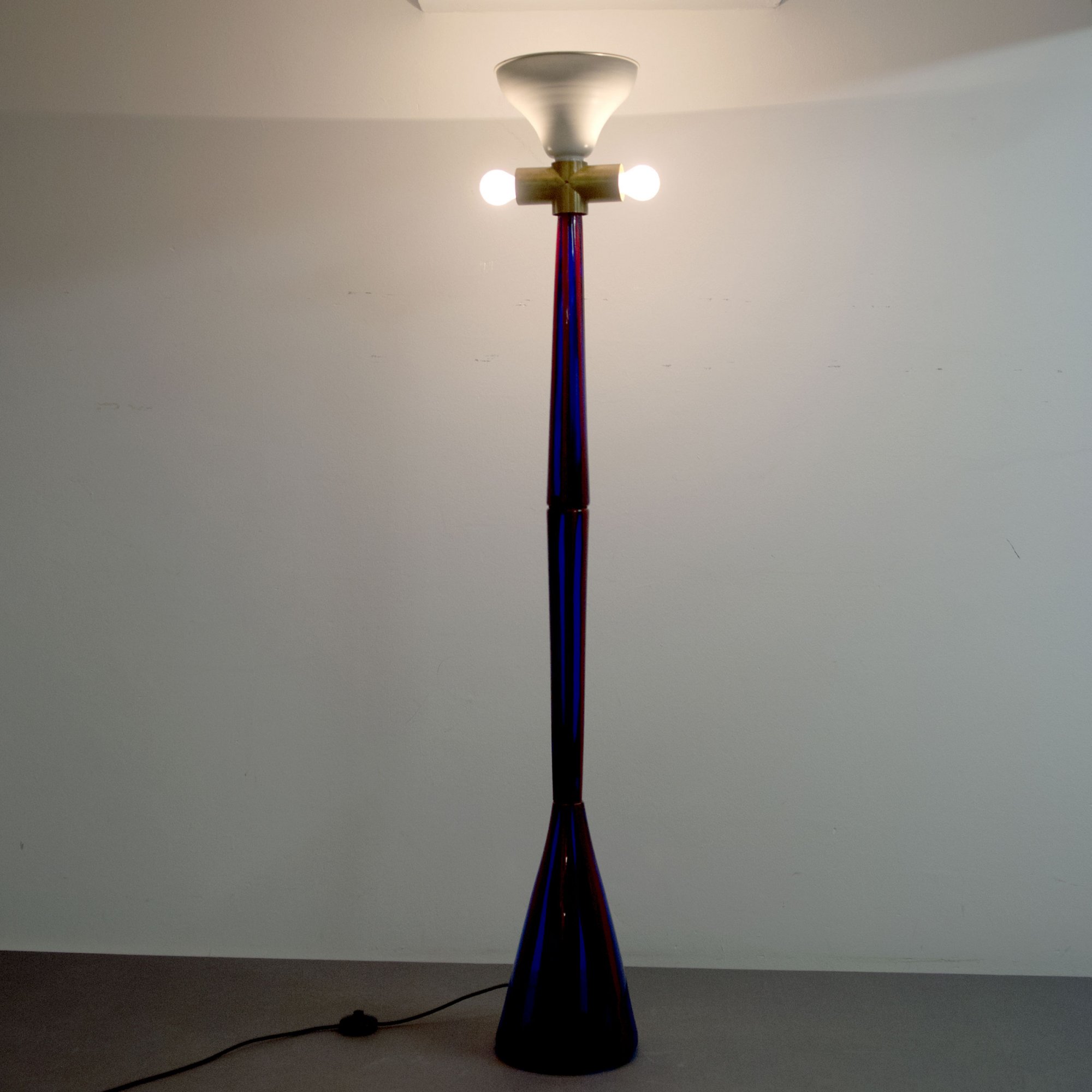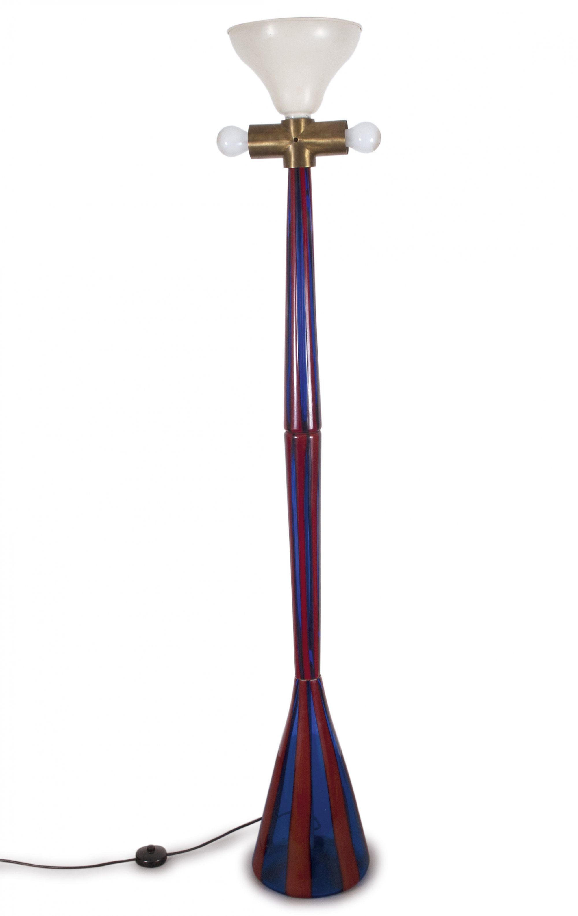 Aus drei kegelförmigen Elementen. Deckenfluter und zwei weitere Elektrofassungen. H. 175 cm. Ausführung: Venini & C. Farbloses Glas mit aufgeschmolzenen Bändern in Blau und Rot.