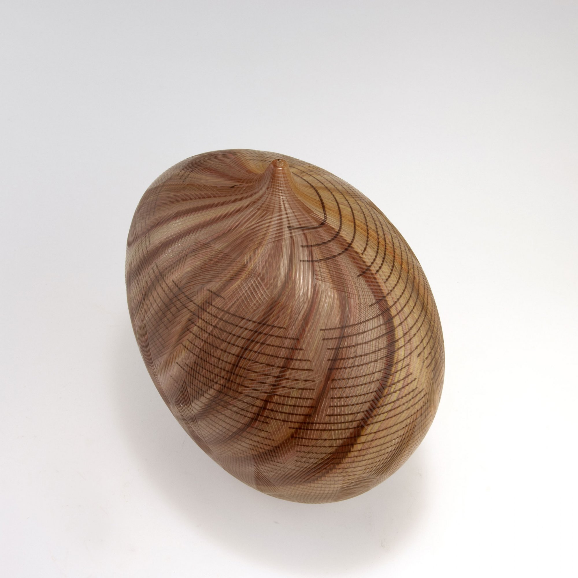 Zweiseitig leicht abgeflachte Herzform mit kurzem kegelförmigen Hals. H. 33 cm. Mehrschichtiges farbloses Überfangglas mit stark wellig gekämmten, vielfarbigen, diagonal angelegten Fadeneinschmelzungen, horizontal feine dunkelviolette Bandeinlagen. Oberfläche vollständig mit dem Rad überarbeitet, in parallelen Reihen angelegte Liniengravuren. Am Boden signiert: Lino Tagliapietra '95 (graviert).