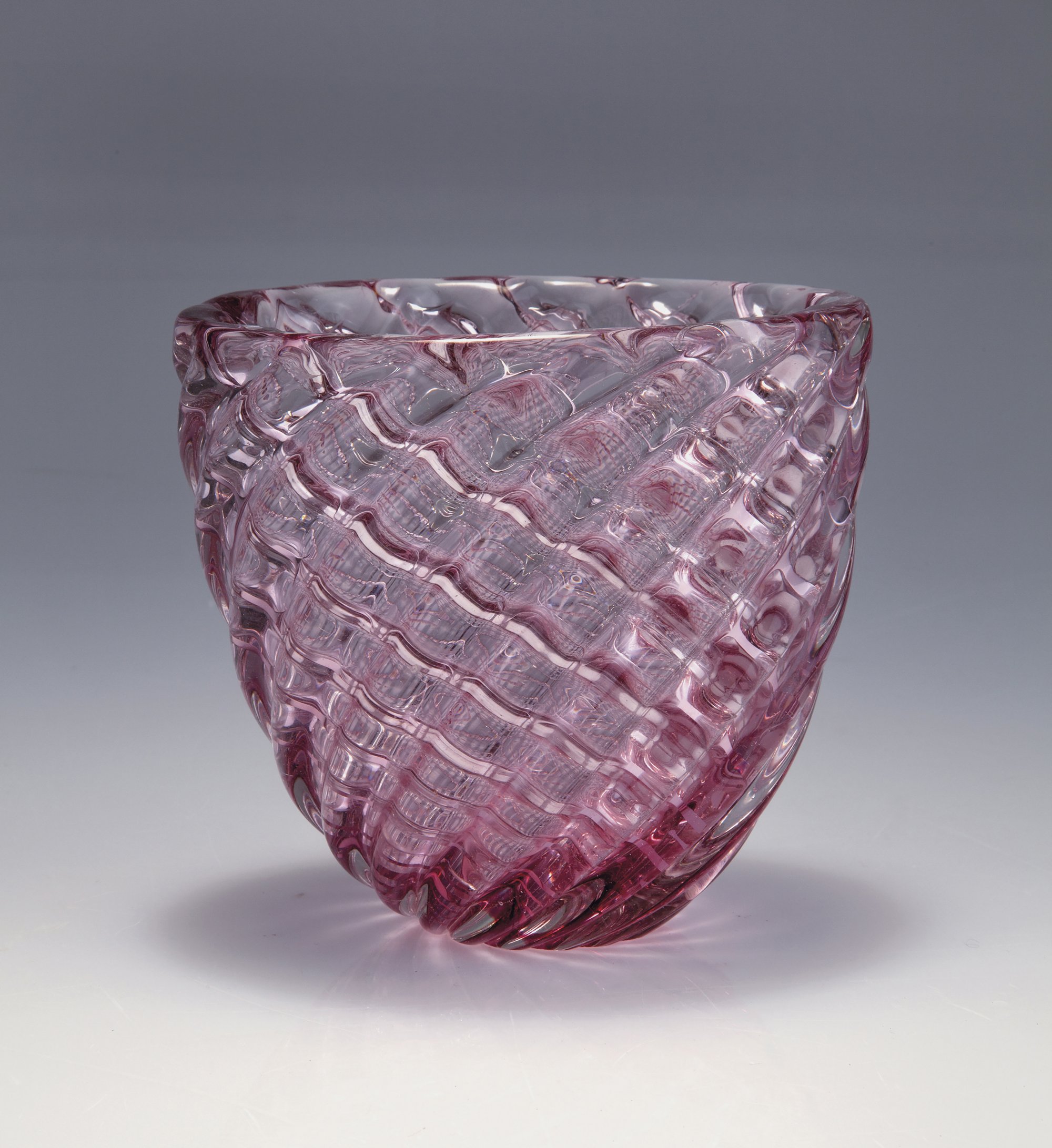 H. 12,3 cm. Farbloses Glas, nach unten rosafarben verlaufend, mit gegenläufig diagonalem Rippendekor. Am Boden bez.: venini murano MADE IN ITALY (Ätzstempel).