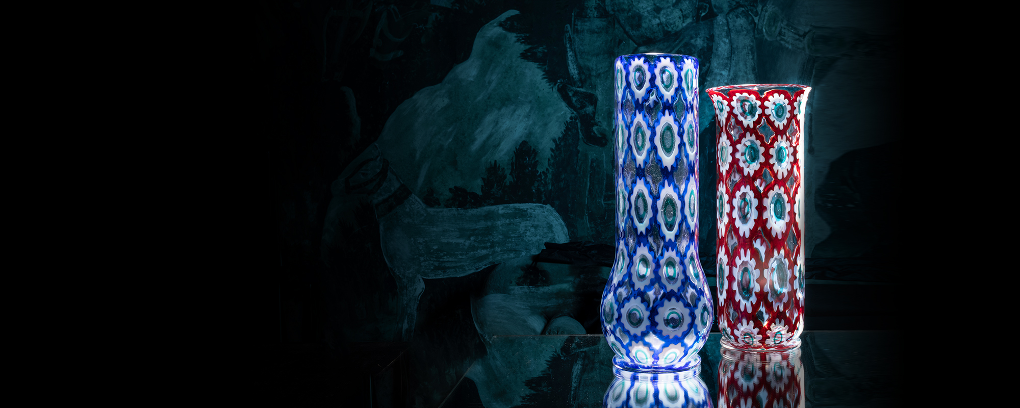Extrem farbenfroh geht es mit Ercole Baroviers Entwürfen der 1960er Jahre weiter. Der Christian Dior gewidmete, in Schottenmuster gehaltene Flakon mit Stopfen aus dem Jahr 1969 ist auf € 5.000 - 6.000 taxiert. Die bereits 1961 kreierte Vase ‚Intarsio‘ in großen hell- und dunkelblauen Dreiecken wird mit € 4.000 - 5.000 in die Auktion gehen. Und von dem äußerst seltenen Dekor ‚Rotellato‘ aus dem Jahr 1970 sind gleich zwei hohe Vasen im Angebot. Hier sind leuchtende Murrine in Blau bzw. Rot mit opaleszentem Weiß dicht aneinander gereiht. Die Assoziation wandert hier zwischen einem lebhaften floralen Textilmuster, wie man es von Strickjacken jener Zeit kennt, und Bildern aus der Technik, da es sich auch um ineinandergreifende Zahnräder handeln könnte. Egal ob rot oder blau, die Vasen sind mit jeweils € 8.000 - 10.000 taxiert.