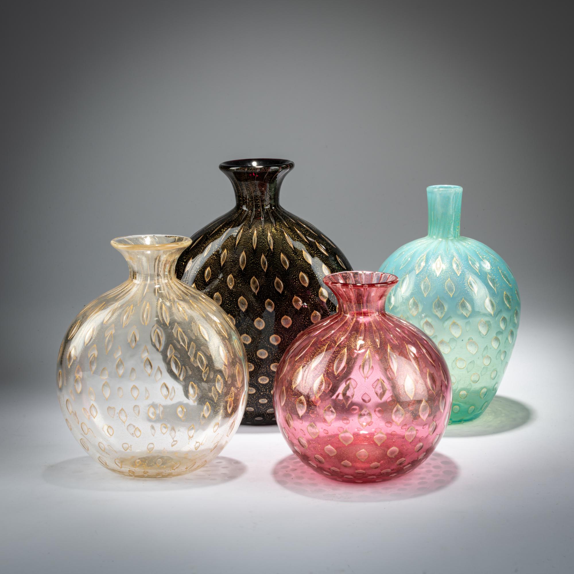 H. 11,5 - 17,5 cm. Ausführung: Archimede Seguso. Überfangglas, farblos mit Goldfolie und rot, türkis bzw. tiefviolett. Drei davon bez.: Archimede Seguso Murano (graviert).