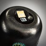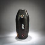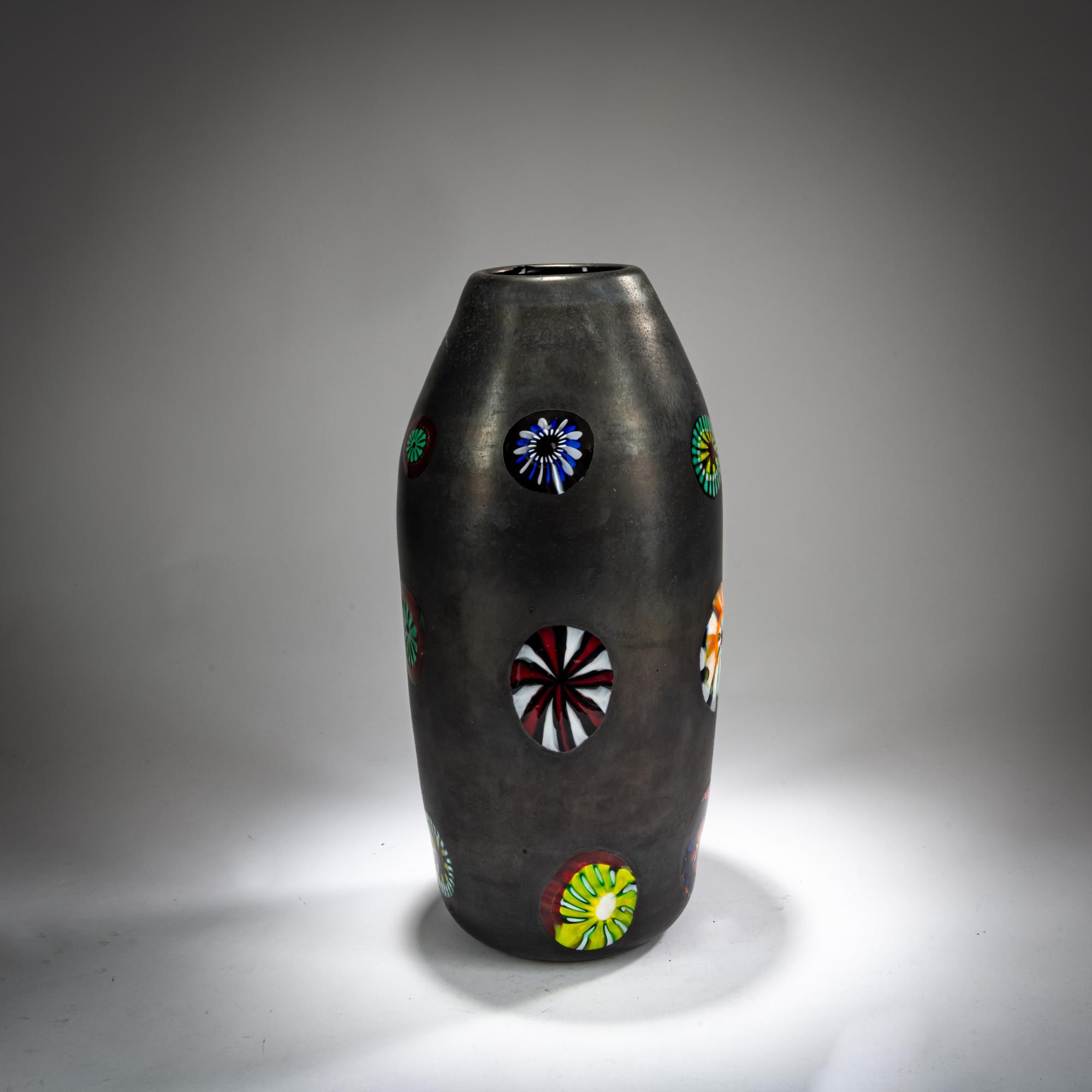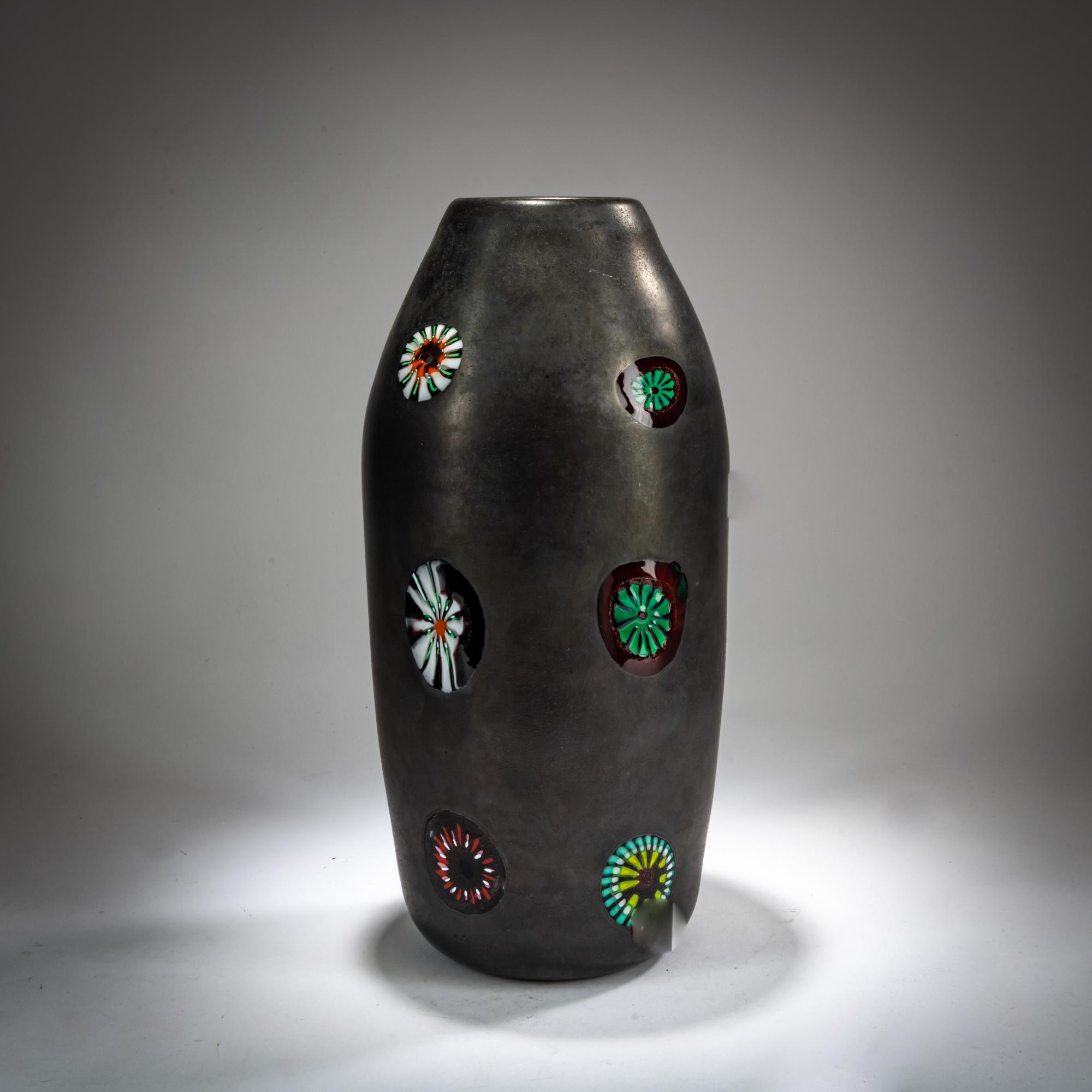 H. 34 cm. Ausführung: Fratelli Toso. Farbloses Glas, tiefgraue irisierte Pulveraufschmelzungen, aufgeschmolzene Murrine in unterschiedlichen Kompositionen und Farben. Bez.: Papier-Herstelleretiketten am Boden.