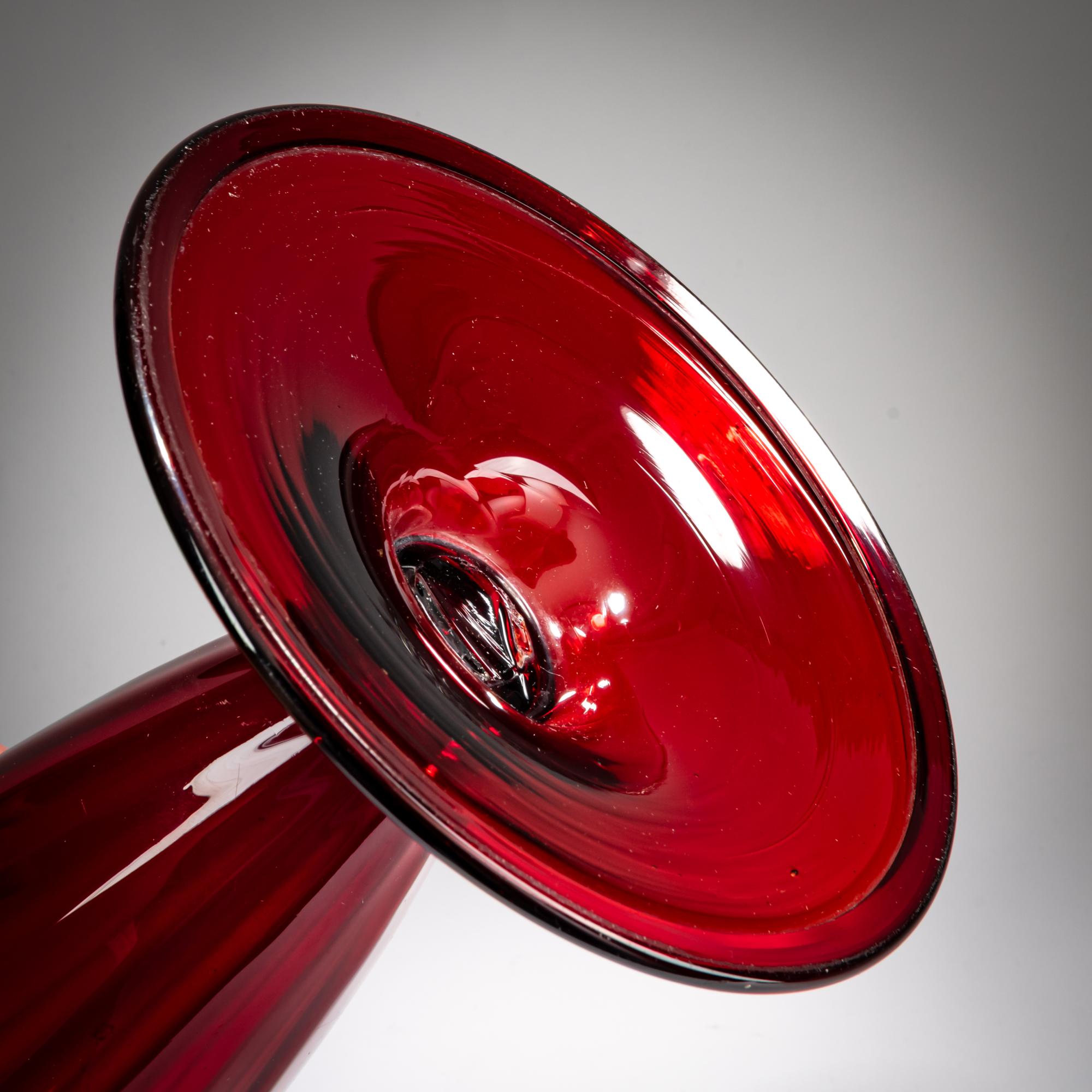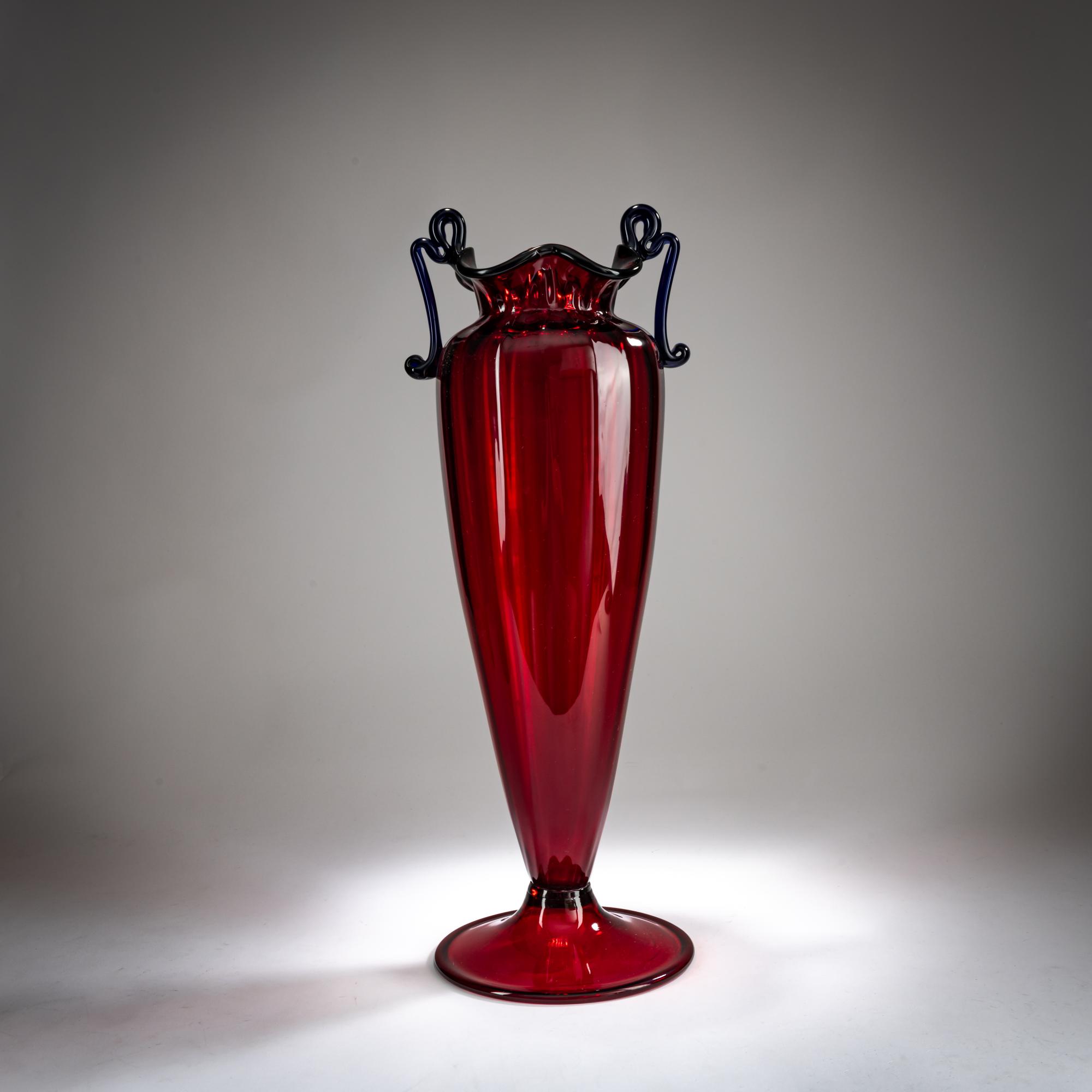 H. 49,5 cm. Rotes Glas, Henkel und Mündung in Blau.