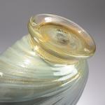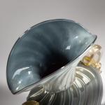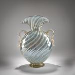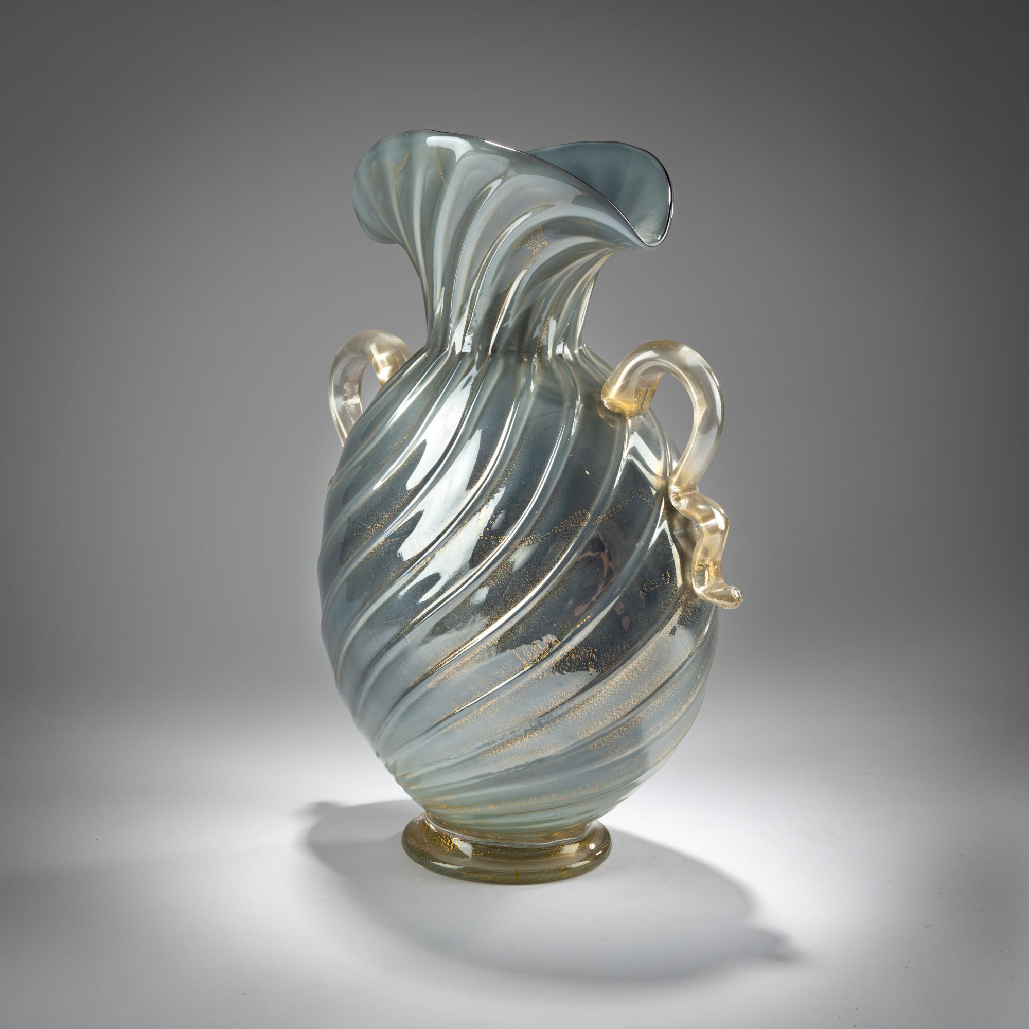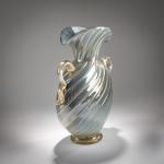 Modell-Nr. Z1518. H. 37 cm. Ausführung: Barovier Seguso & Ferro. Überfangglas, farblos, dunkelviolett und opalweiß, Fuß und Henkel farblos, aufgelegte, fein zersprengte Goldfolie.