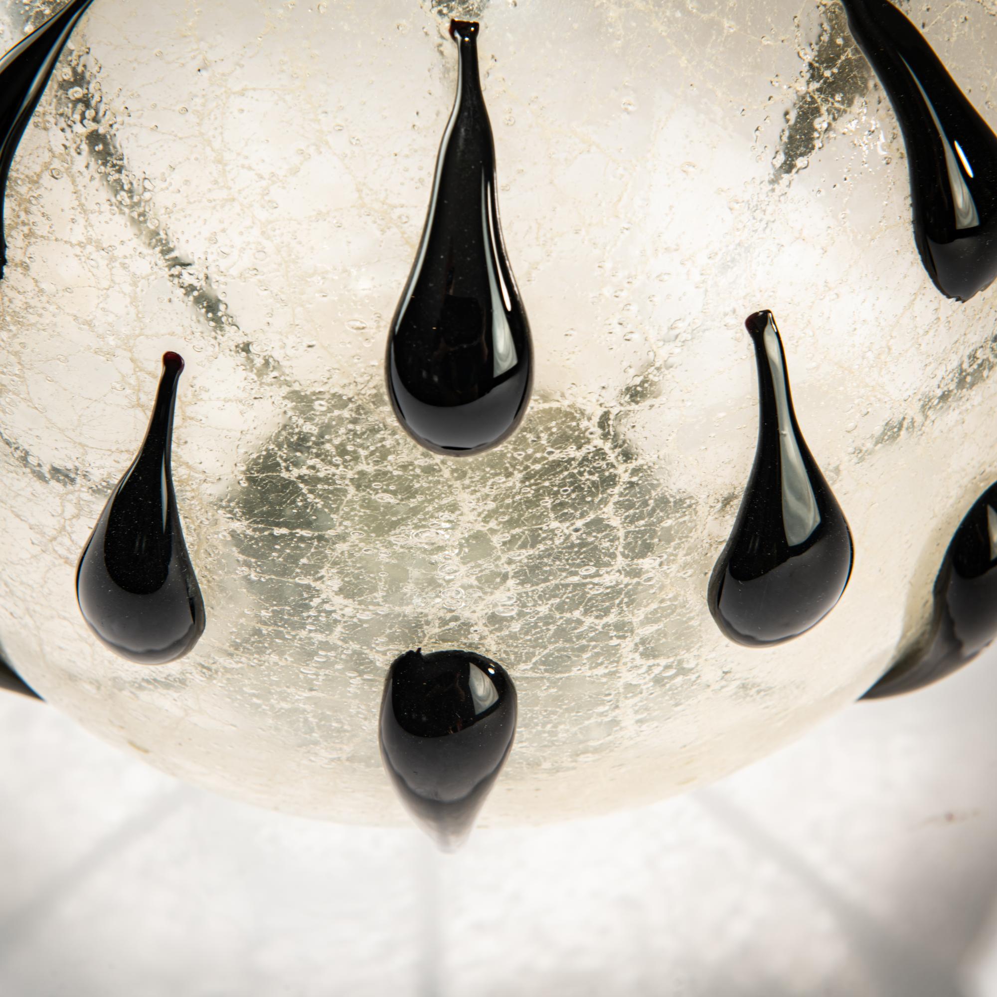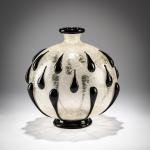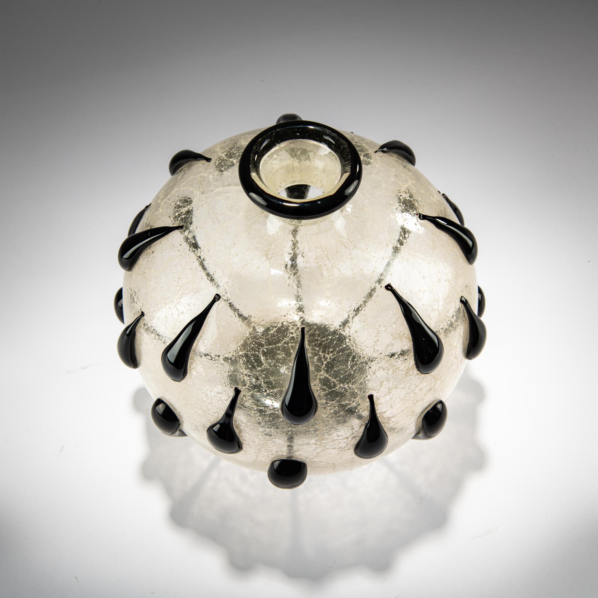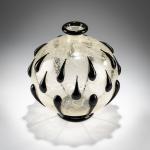 Kugelform mit 24 applizierten Tropfen; enger Hals mit ausschwingender Mündung; auf Hohlstand. H. 23,5 cm. Ausführung: Fratelli Barovier. Farbloses, leicht milchiges, blasiges und craqueliertes, sog. 'Primavera'-Glas; Fuß, Applikationen und Mündung aus schwarzer Glasmasse.