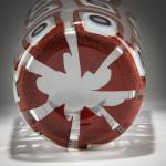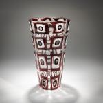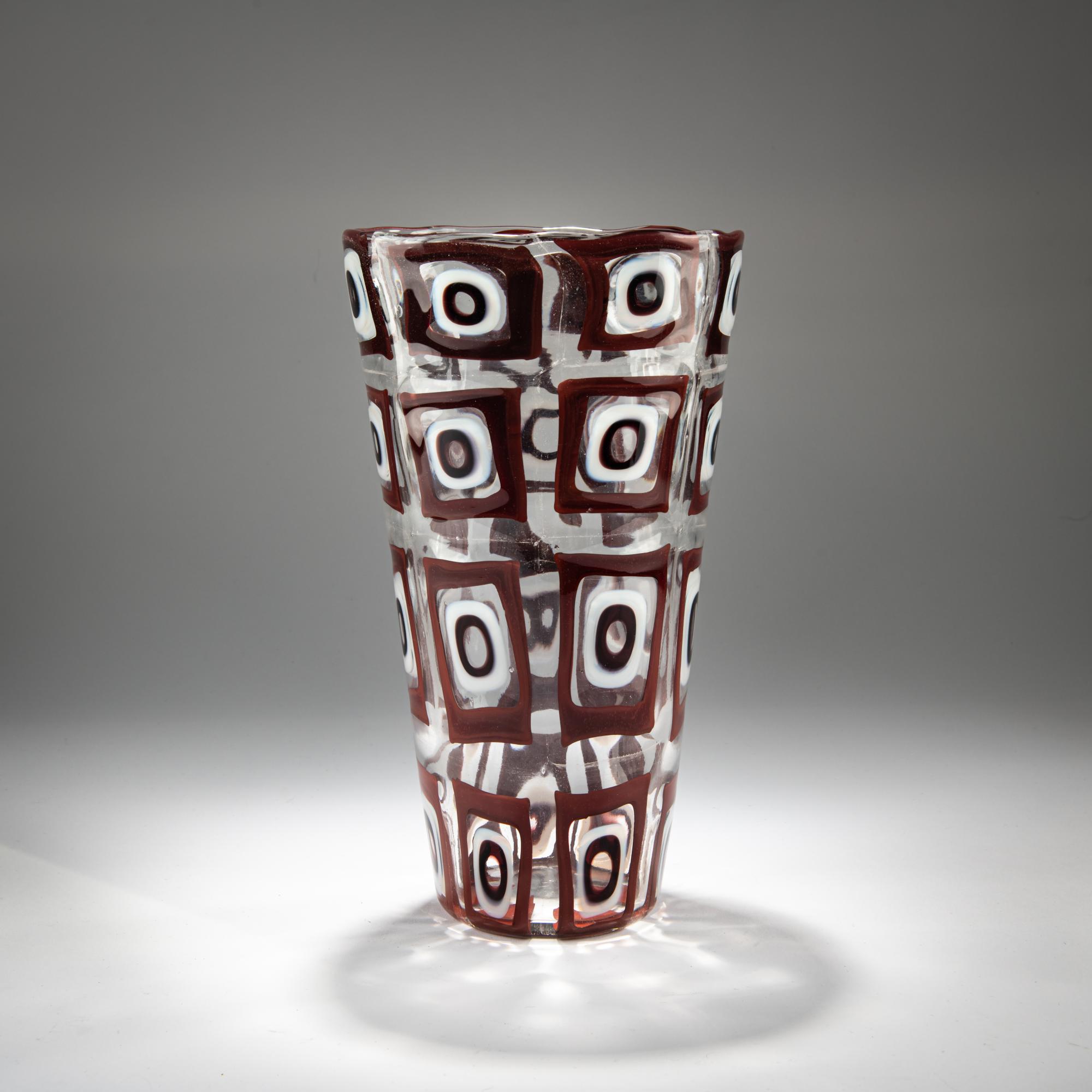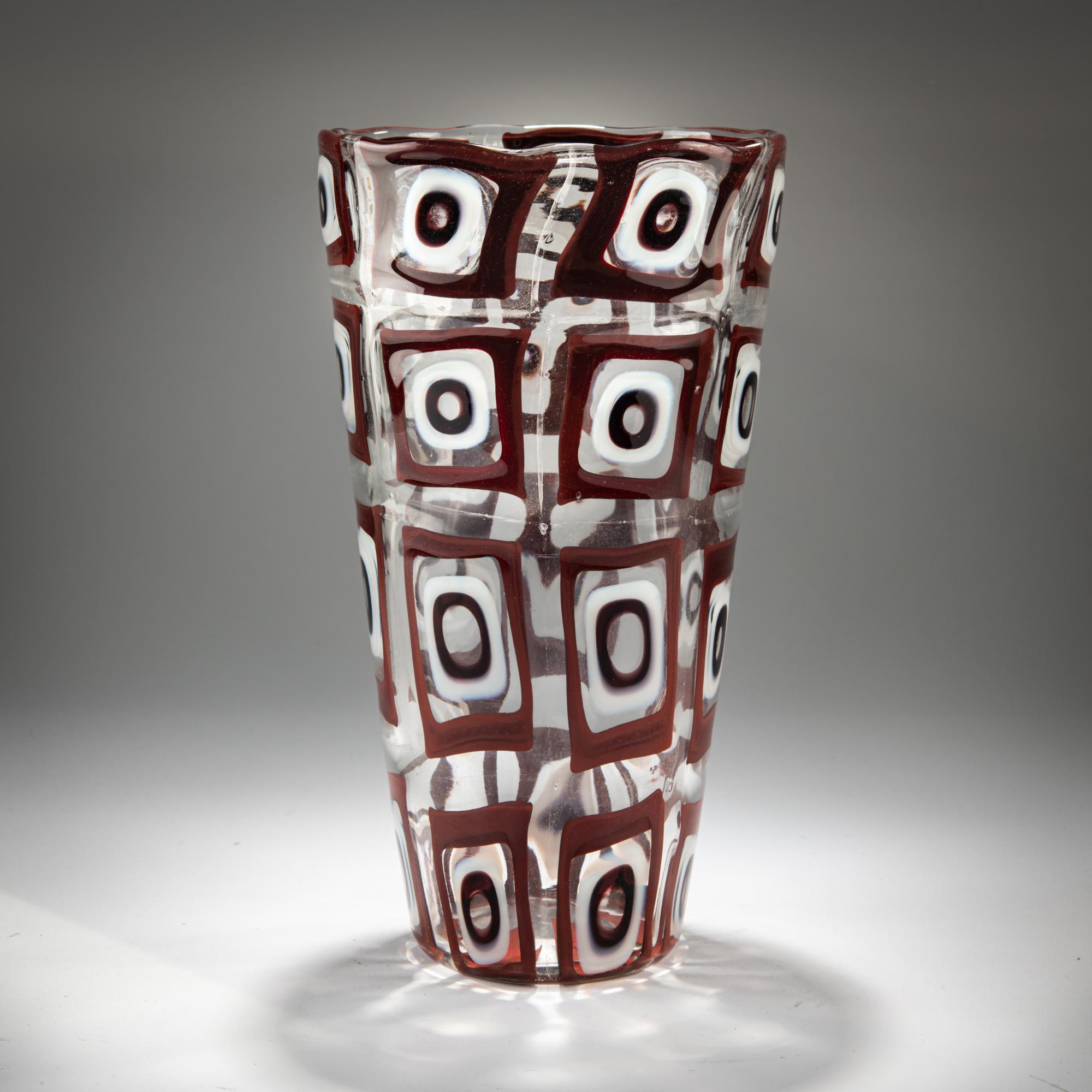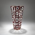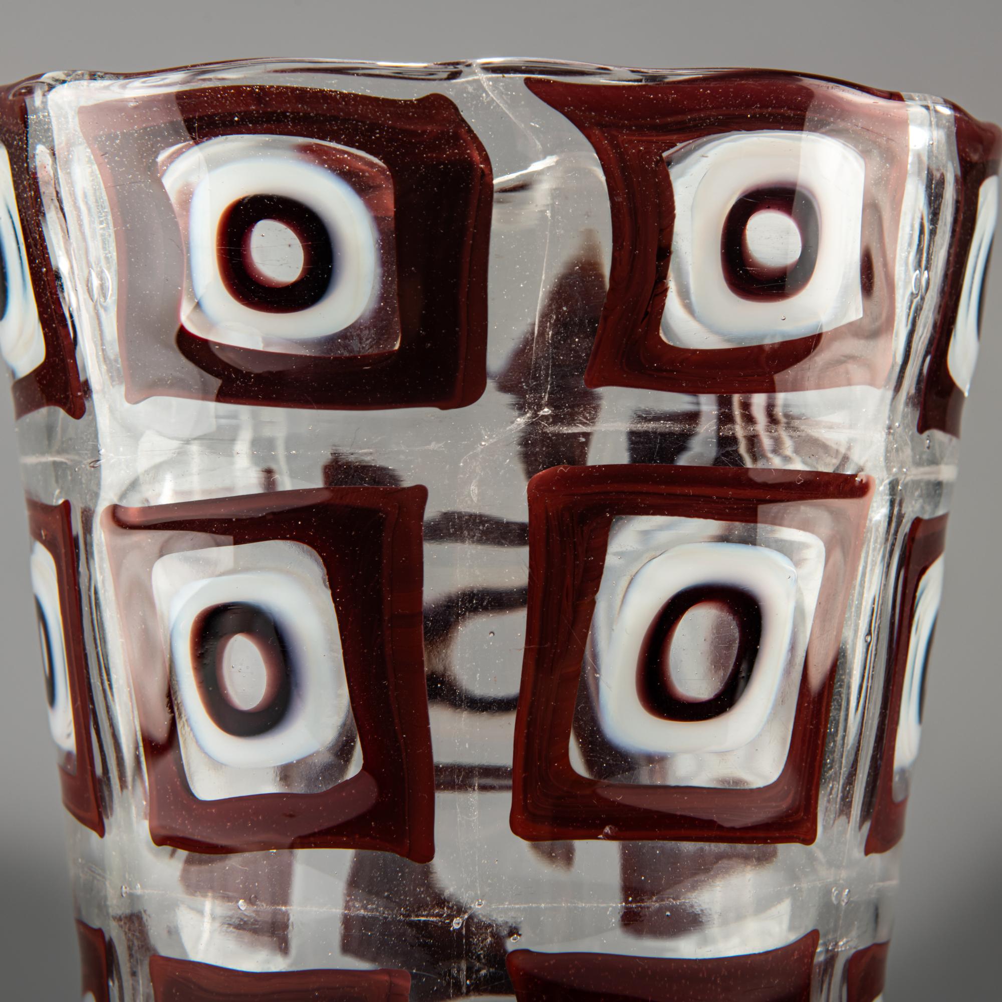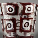 Hohe Becherform. H. 29,5 cm. Ausführung: Barovier & Toso. Farbloses Glas mit aufgeschmolzenen großen, rechteckigen Murrinen aus farblosem Glas mit rostroten und milchweißen Ringen. Am Boden bez.: Ercole Barovier 9/10/65 (graviert).