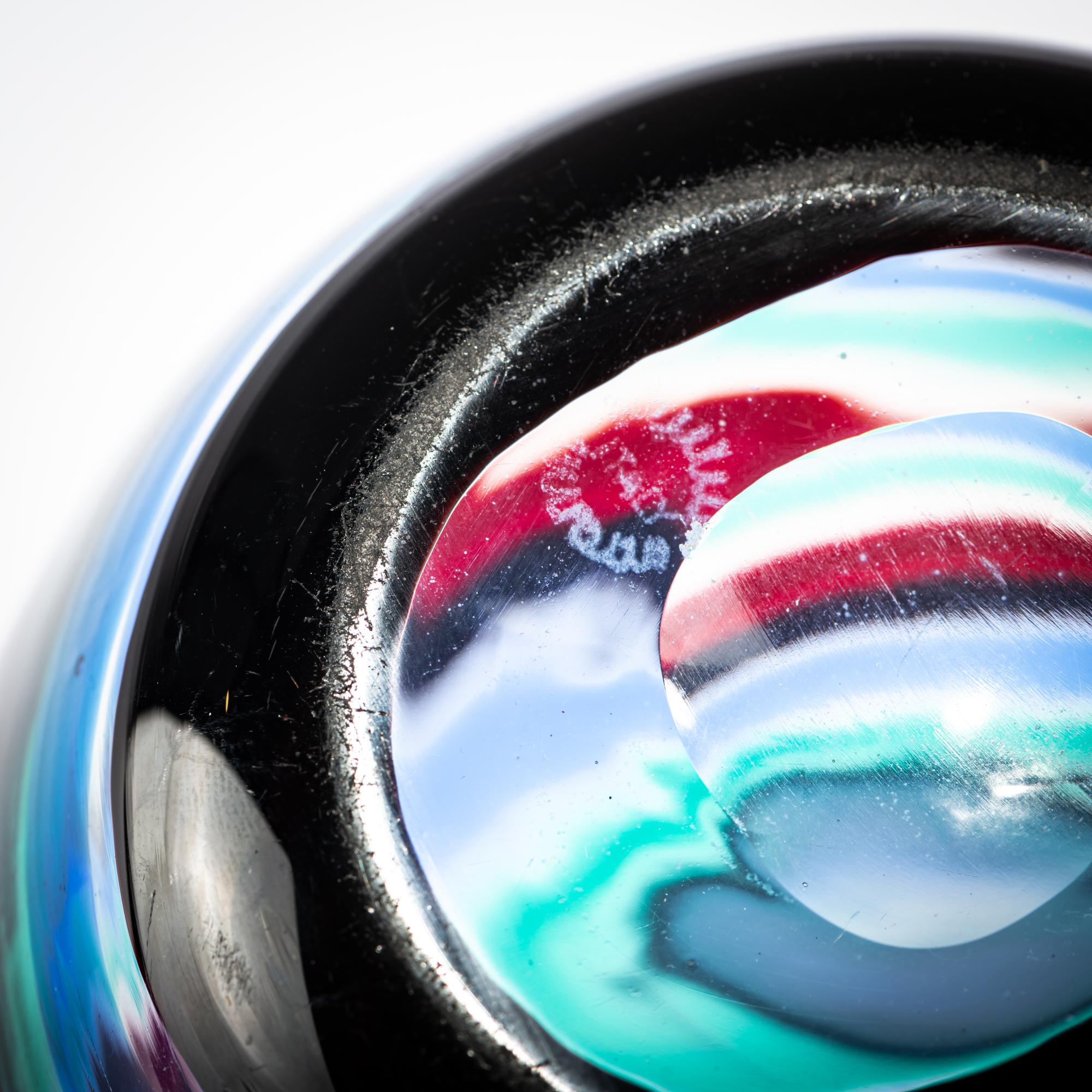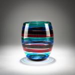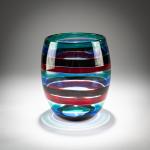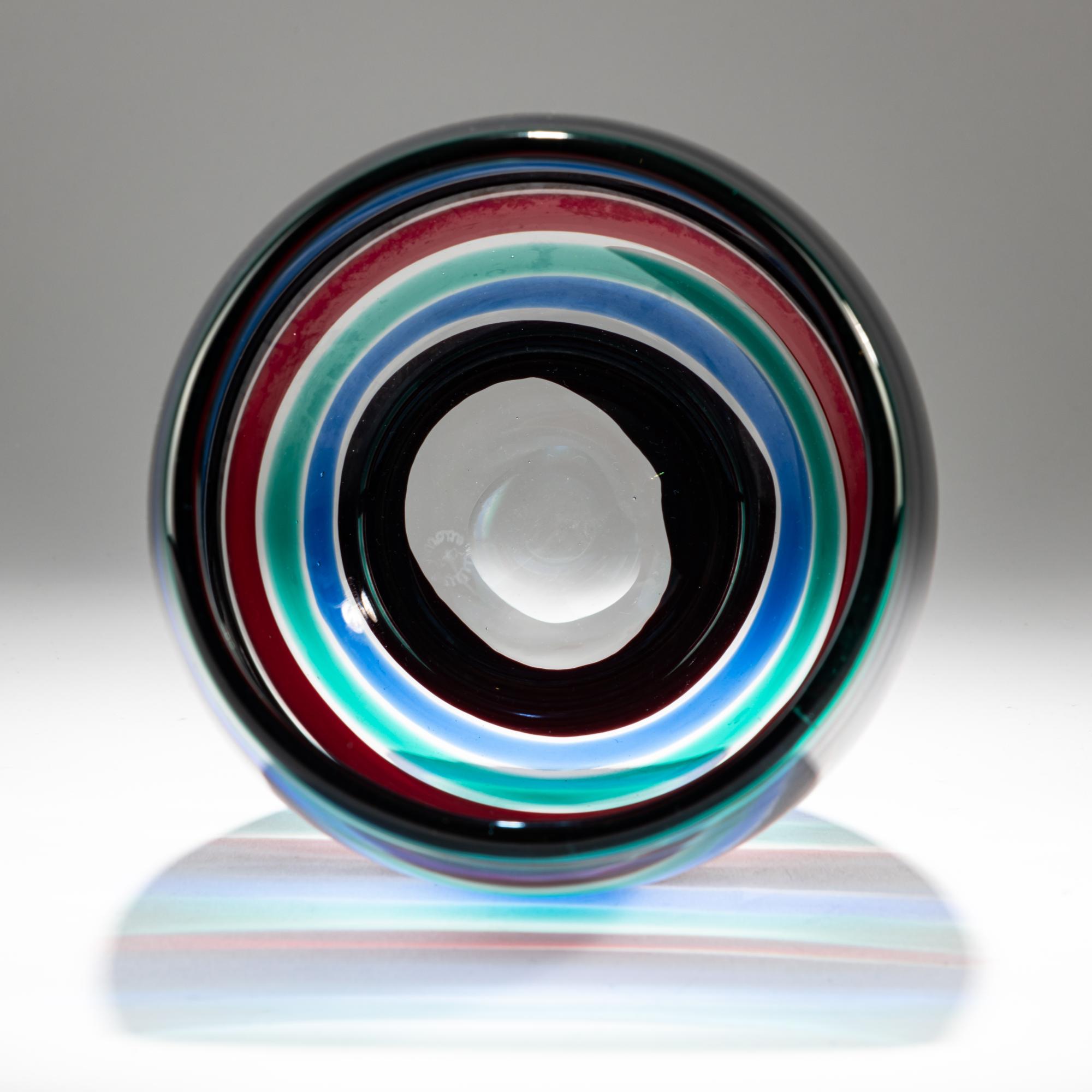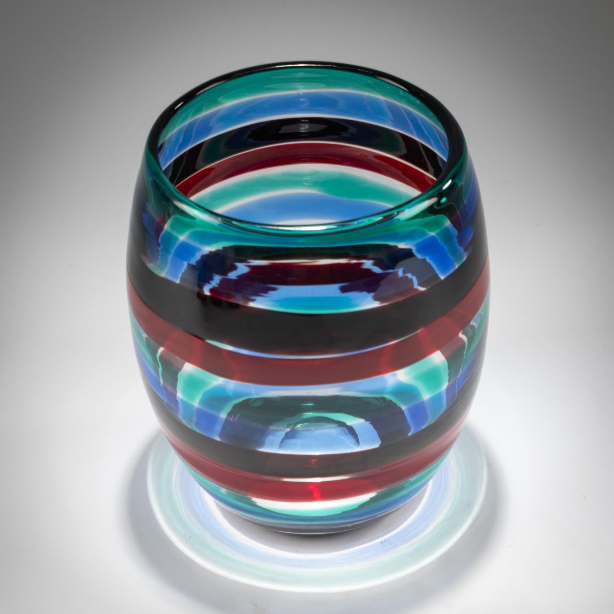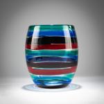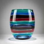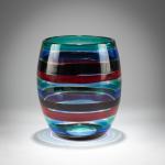H. 19,2 cm. Ausführung: Venini. Farbloses Glas mit aufgeschmolzenen Bändern in Grün, Blau, Tiefviolett und Rot. Am Boden bez.: venini murano ITALY (runder Ätzstempel).