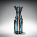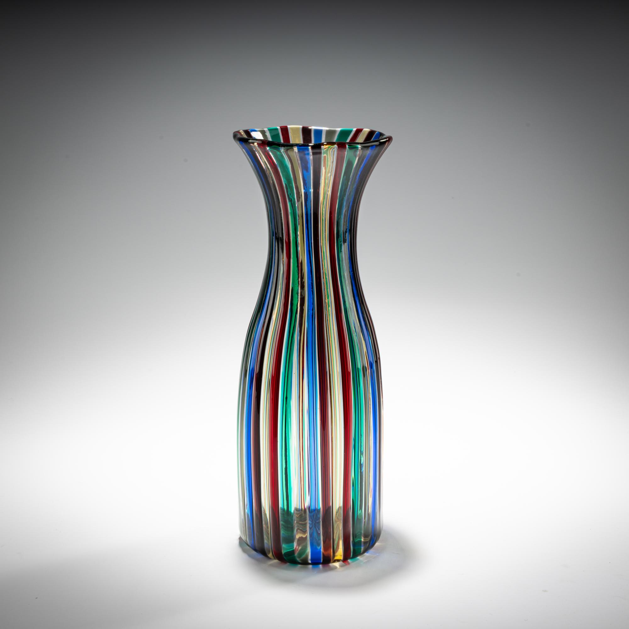 Modell-Nr. 972. H. 26,5 cm. Ausführung: Venini. Farbloses Glas mit aufgeschmolzenen Stäben in sechs Farben, in Rot, Grün, Grau, Blau, Violett und Gelb. Am Boden Klebeetikett: VENINI MURANO VENEZIA. MADE IN ITALY.