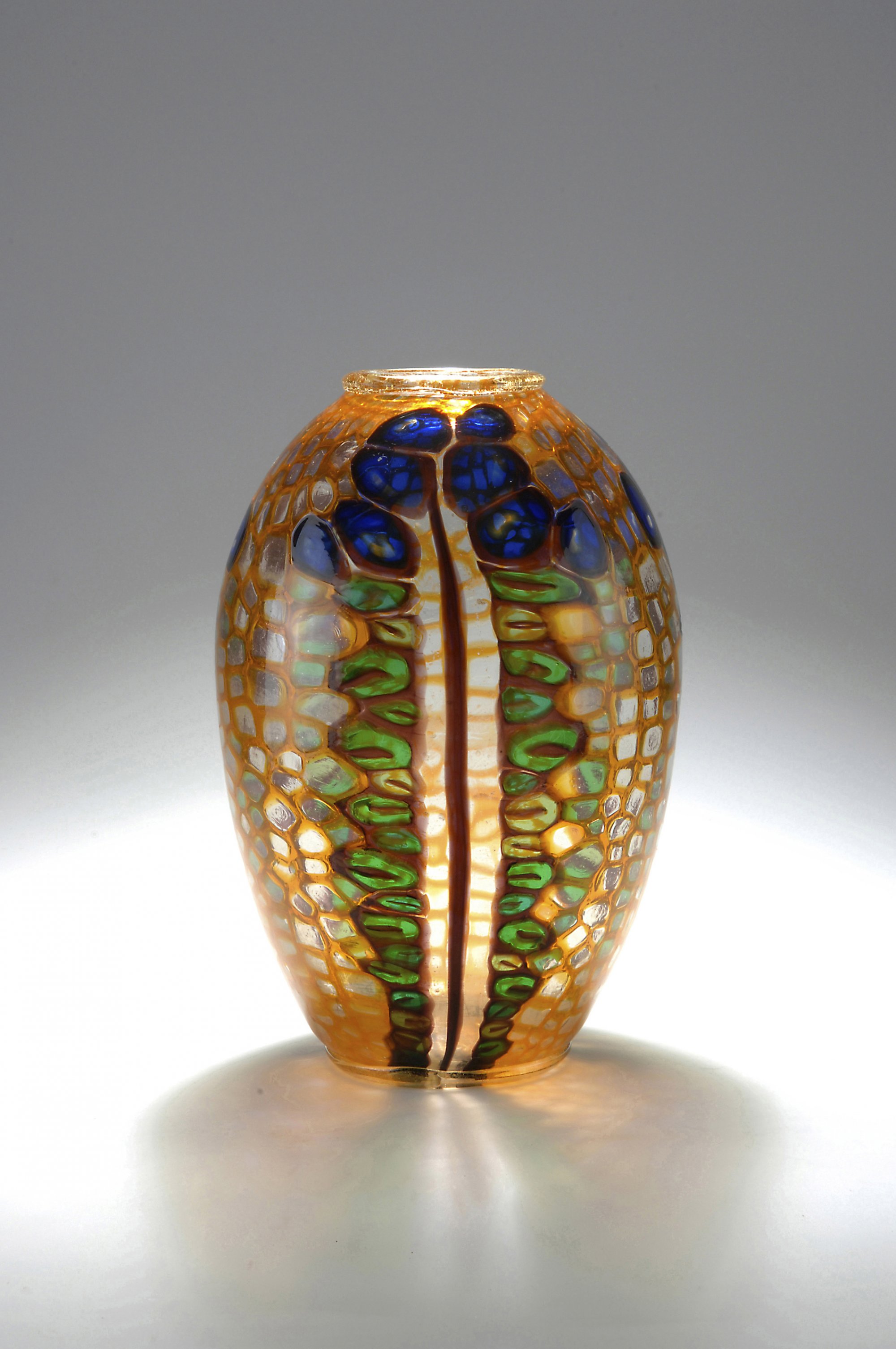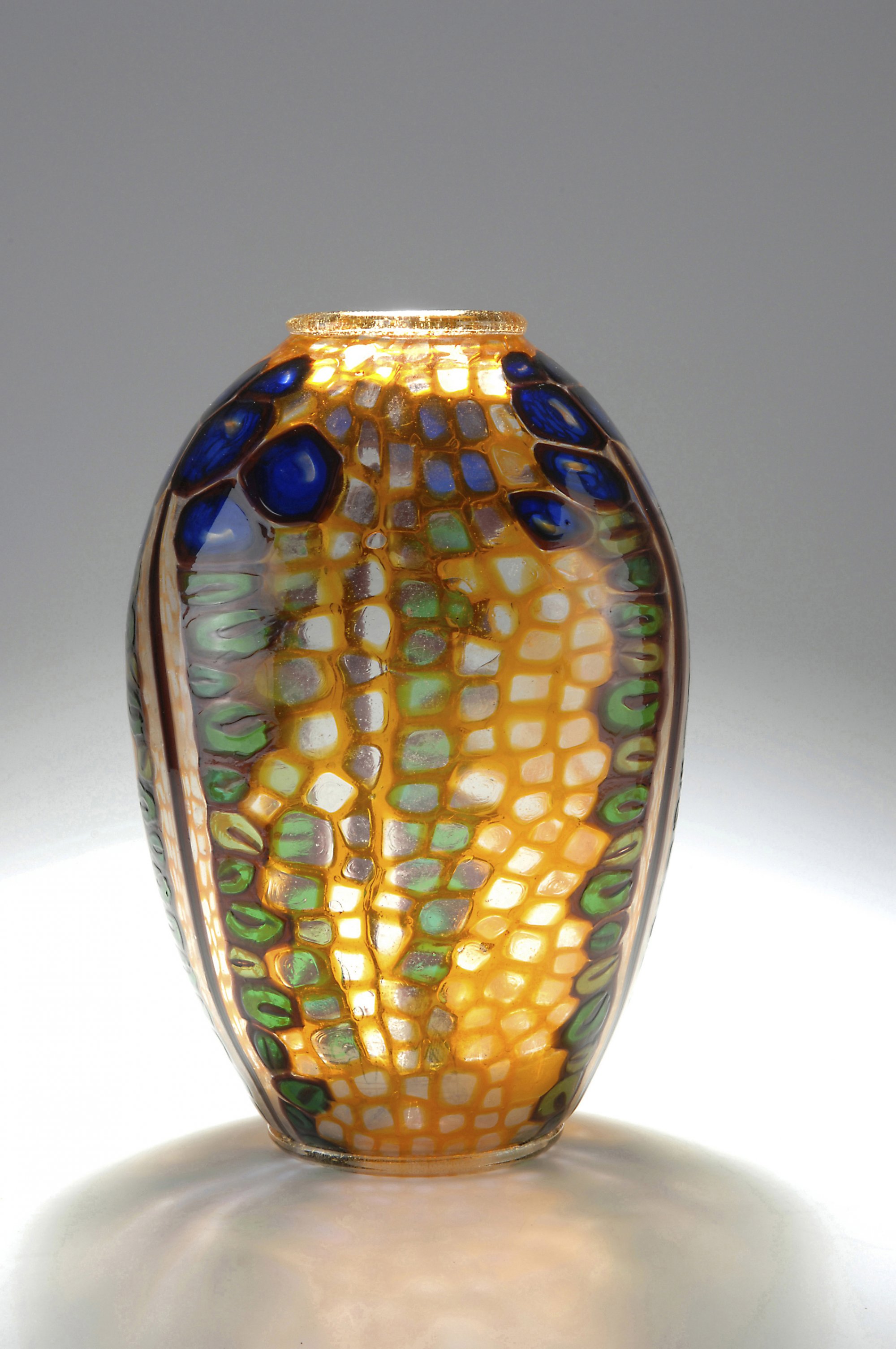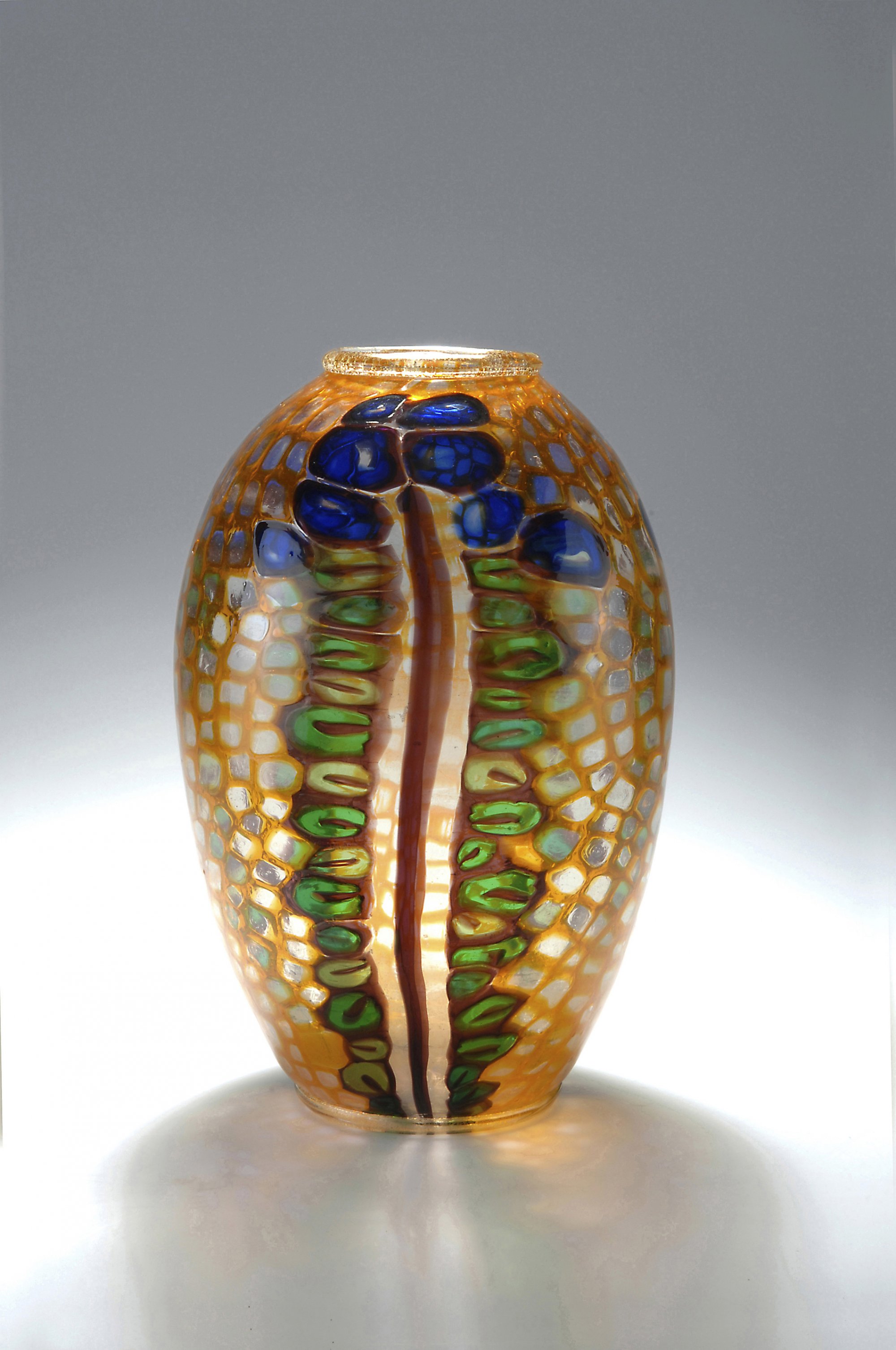 Hohe Ovalform, Mündung mit aufgeschmolzenem Ring; Standring. H. 34,5 cm. Entwurf: 1924/ 25. Ausführung: Vetreria Artistica Barovier & C. Umlaufend drei Blütenstengel, farbloses Glas mit aufgeschmolzenen Murrinen in Orange, Grün, Blau und Violett, partielle Stabaufschmelzungen in Violett, Mündung und Standring mit fein zersprengter Goldfolie.