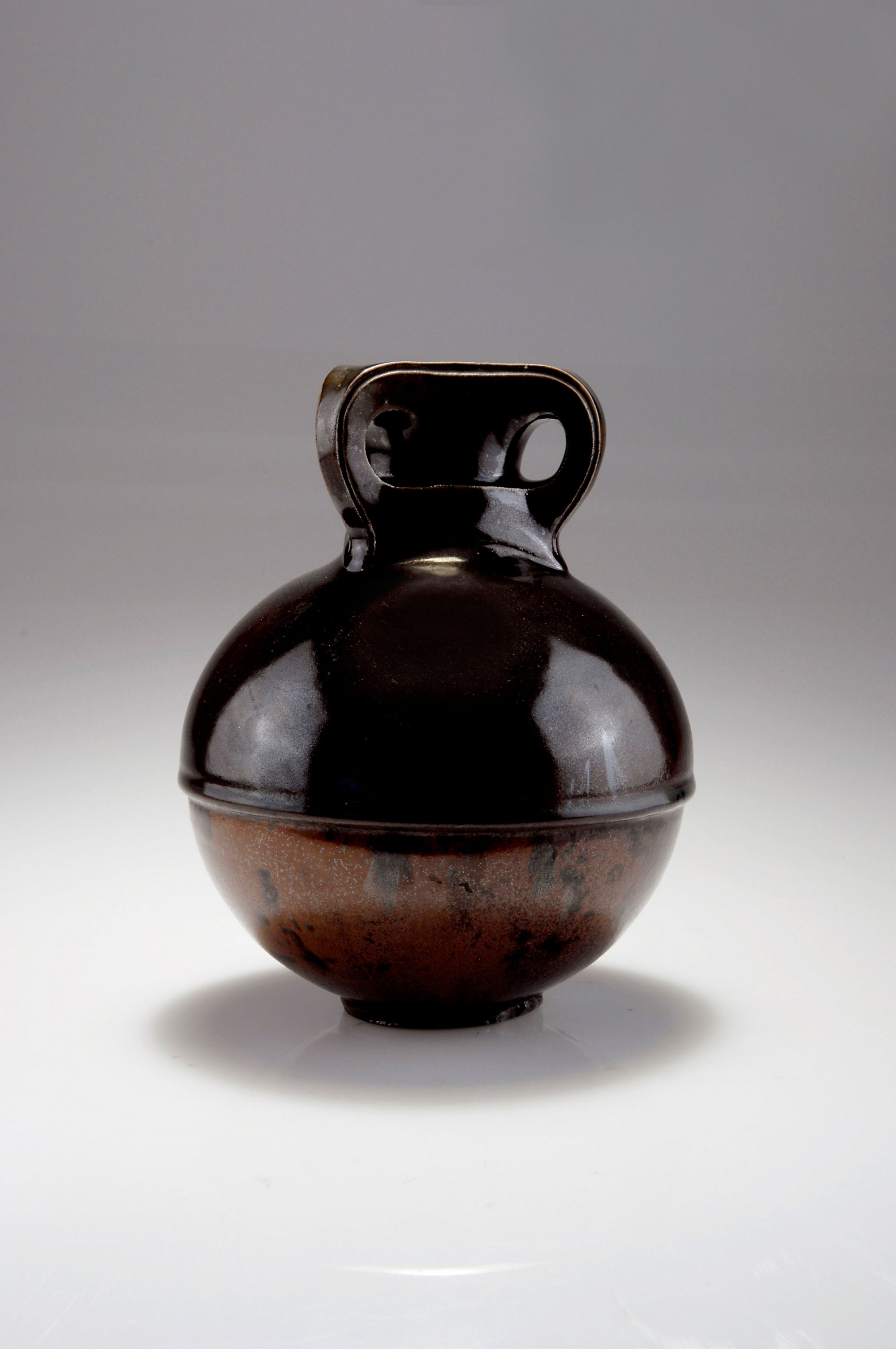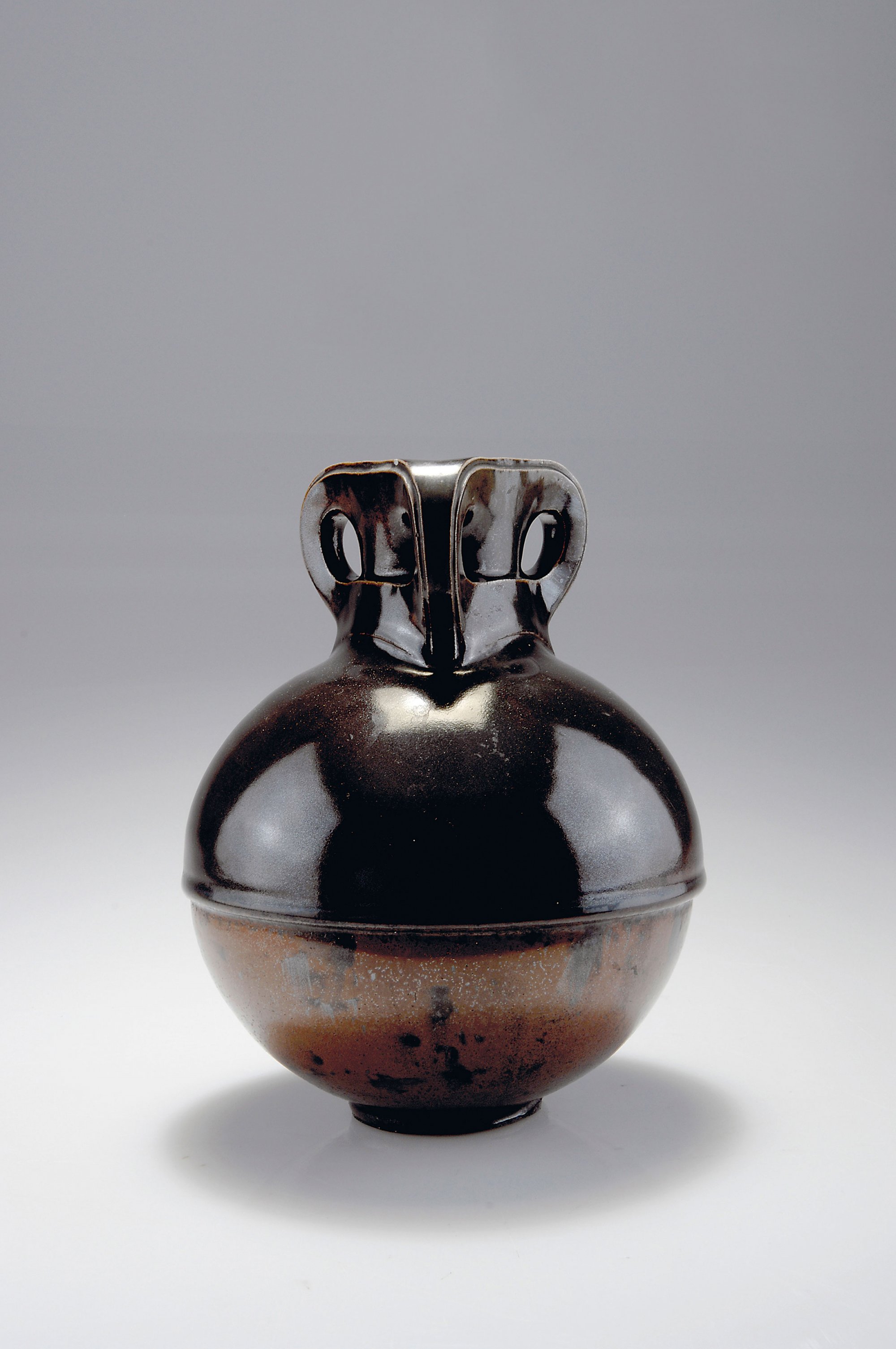 Kugelkorpus auf rundem Stand, gerader Rundhals, umschlossen von einem Dreieck, aus dem drei Griffe hervorwachsen, dreieckige Mündung. H. 21,4 cm. Ausführung: Reinhold Hanke, Höhr. Steinzeugscherben, dunkelbraune und geflammt braune Scharffeuerglasur. Bez.: Künstlersignet (geprägt).