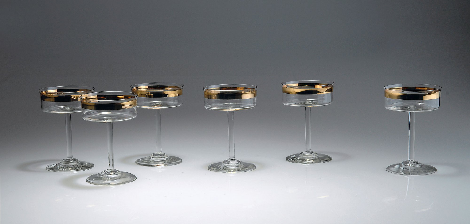 Weite, gerade Kuppa mit leicht ausgestellter Mündung auf geradem Schaft mit gewölbtem, einfach abgesetztem Fuß. H. 13,3-13,5 cm. Ausführung: Benedikt von Poschinger, Oberzwieselau. Farbloses Glas mit Goldrand.