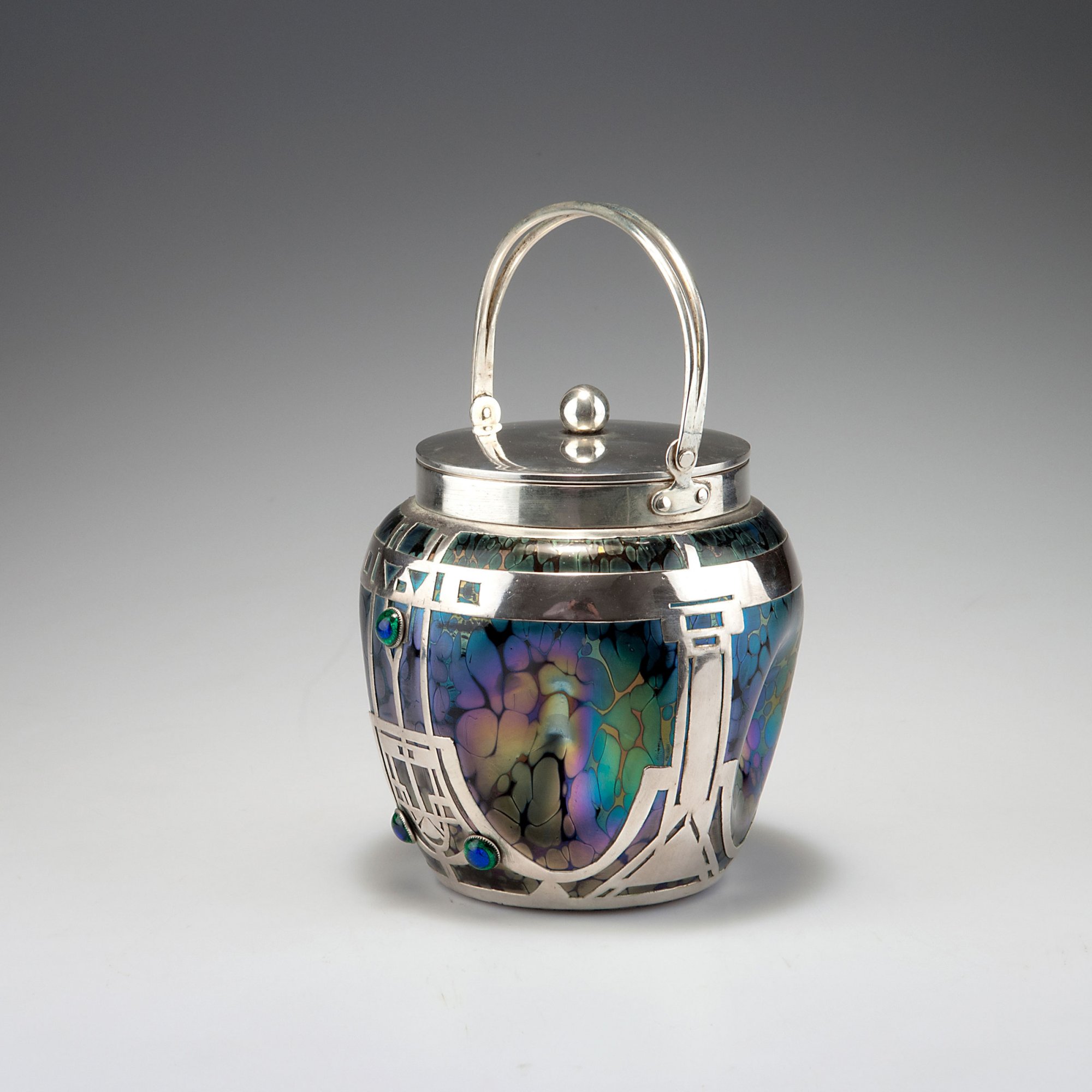 Wilhelm Kralik son, Eleonorenhain. Biquitdose, c1902. H. 23 cm. Purple glass, fused silver yellow crushed glass, strong petrol lustre, silver overlay, glass beads on foil, silver-plated metal mounting.