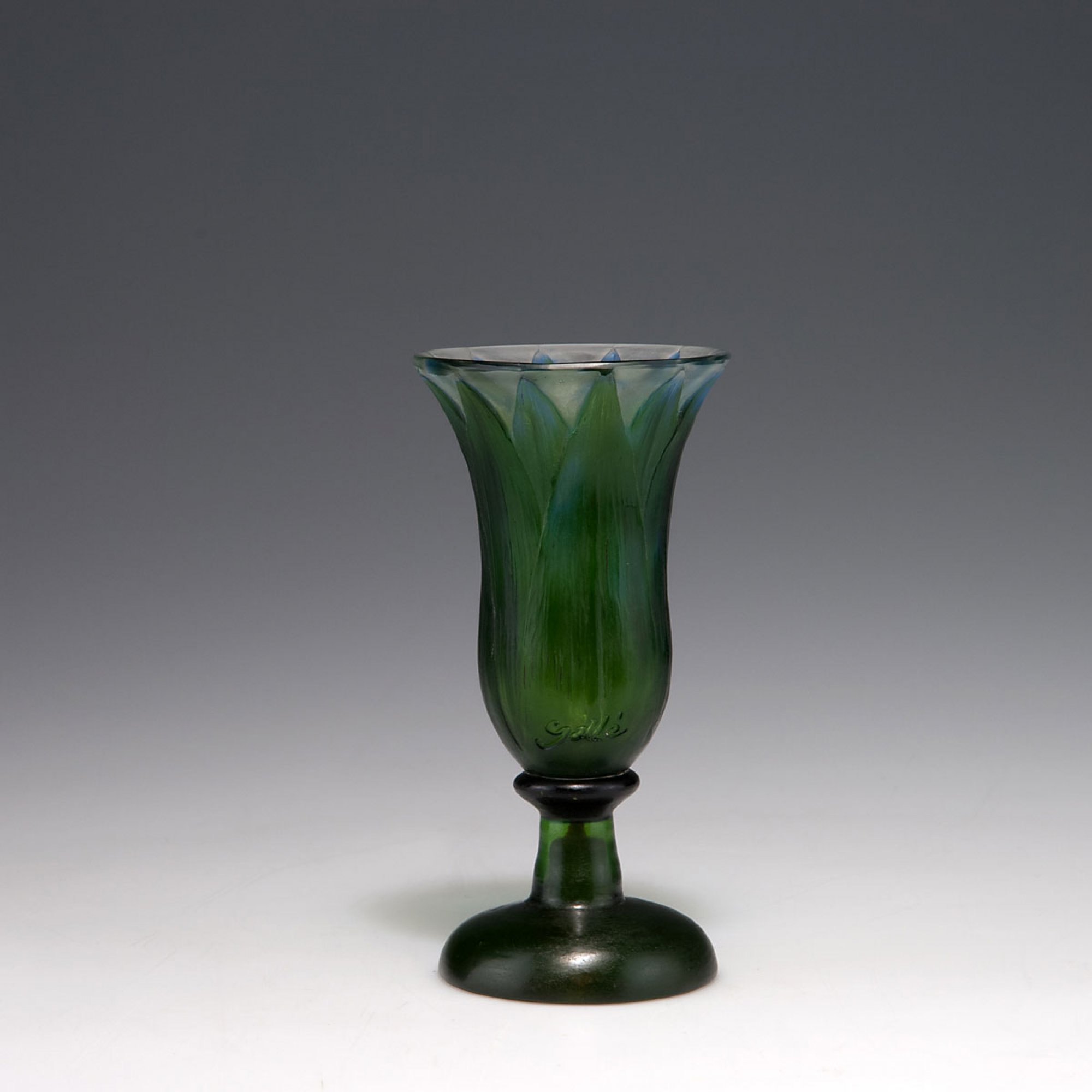 Emile Gallé. 'Lotus' goblet, 1902. H. 14.3 cm. Cased glass, clear, blue and green, foot amber and green. Cup cut. Signed: Gallé.