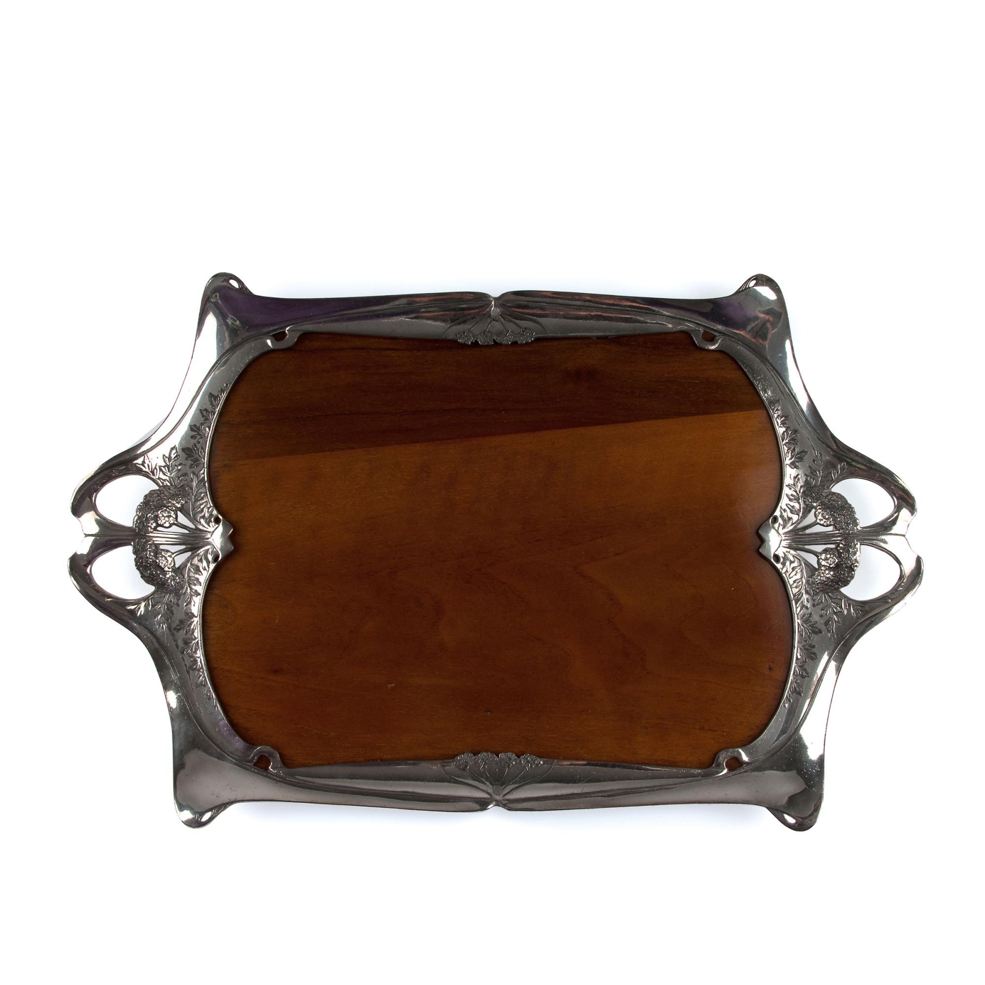 Christofle, Paris. Tray, 1920s. 55 x 36.3 cm. Silver-plated metal, reliefed floral pattern, wood. Marked: Cock, 4419, knight.