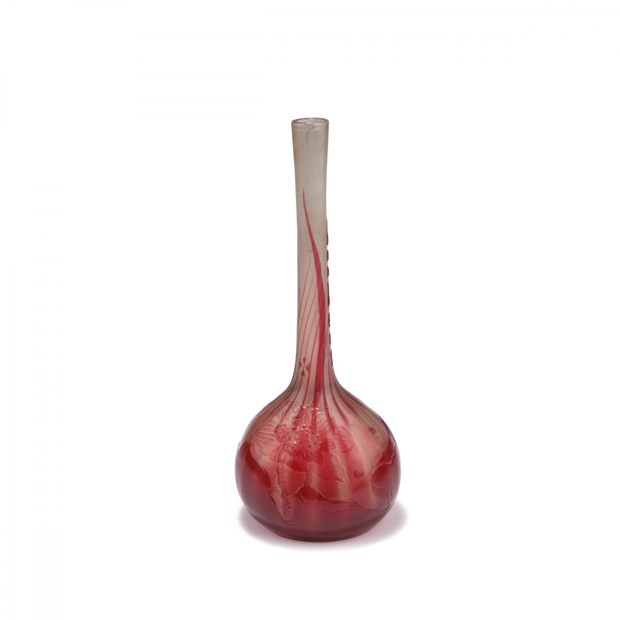 Emile Gallé, Nancy. 'Bonheur' - 'Lotus' vase, c1900. H. 23.1 cm. Cased glass, clear and wine red. Multiply etched pattern with lotus. Inscribed: 'bonheur'. Signed: Gallé.