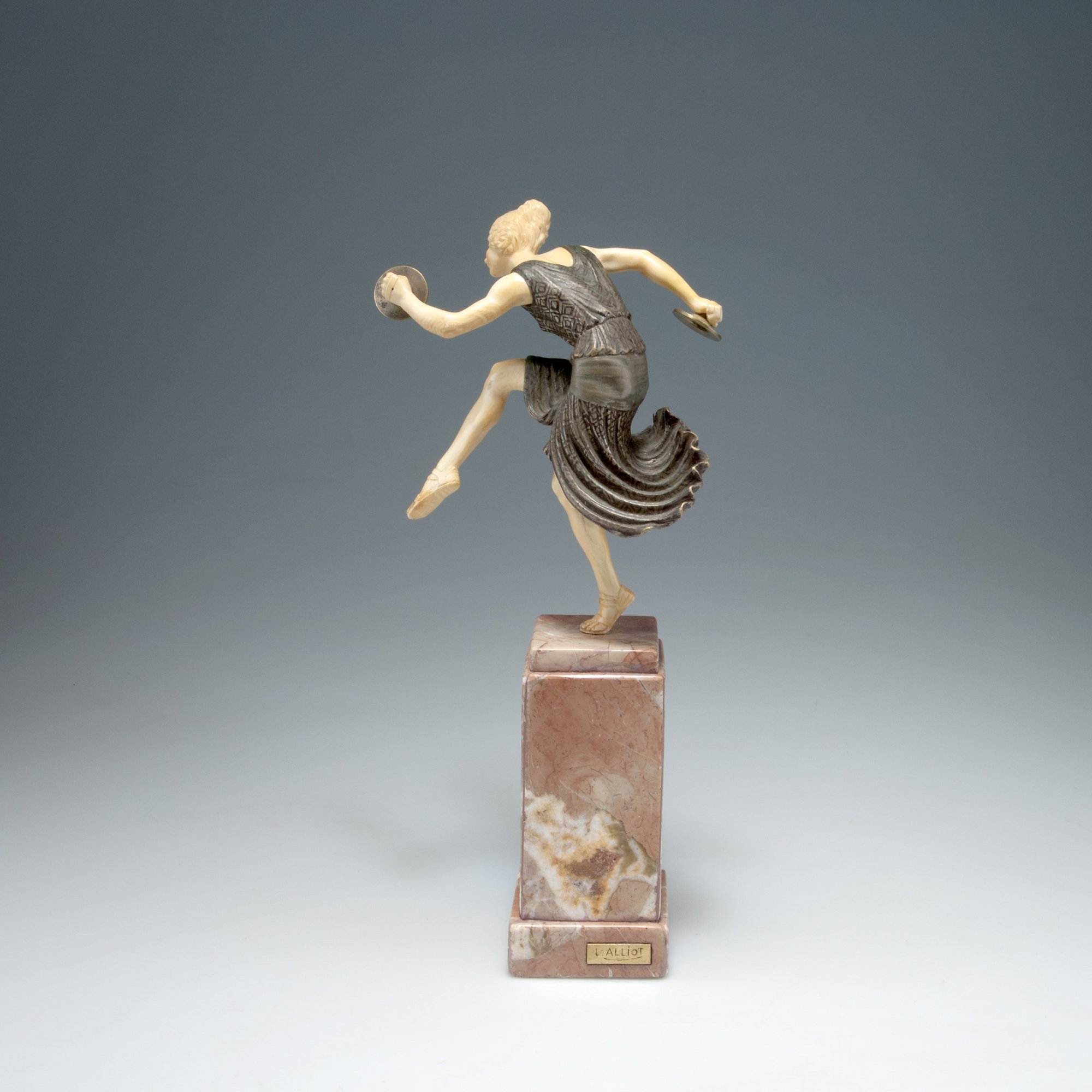 Lucien Alliot. 'Danseuse aux cymbales', 1920s. H. 36.6 cm. Bronze and carved ivory. Part silver-plated pale marble. Marke: L. ALLIOT.