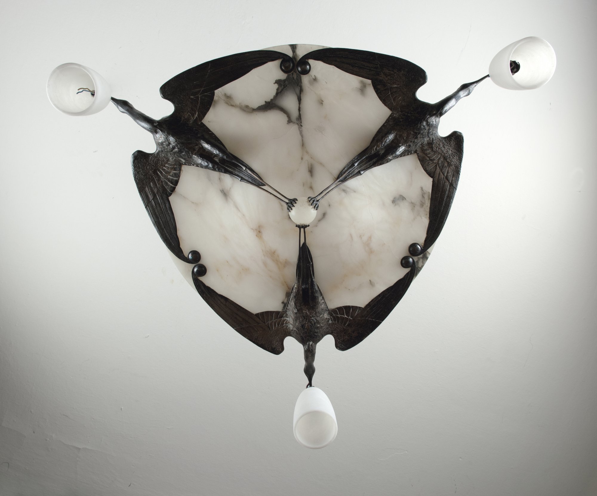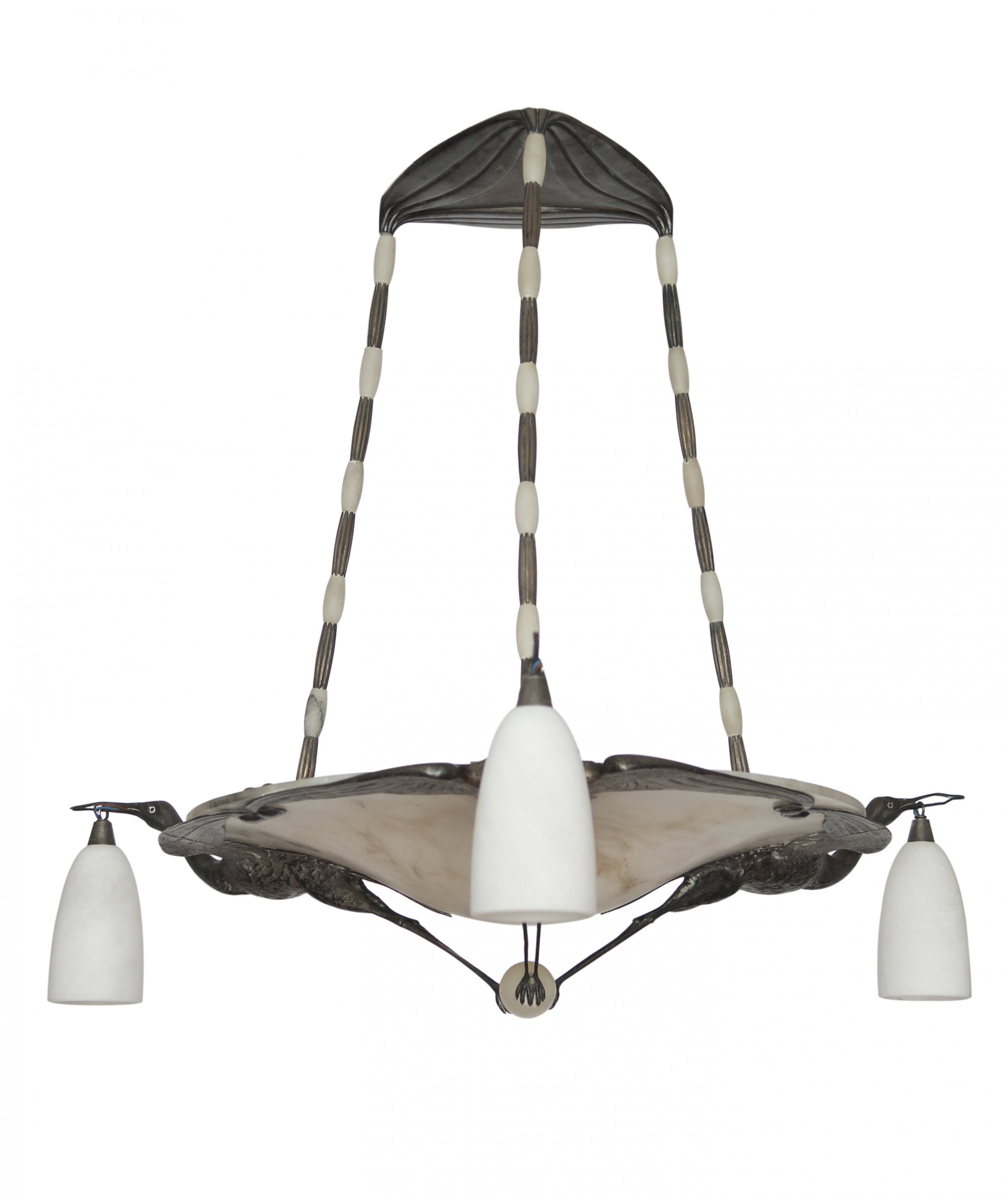 Albert Cheuret, Paris. Ceiling light, c1925. H. 85 cm, D. 89 cm. Silver-plated bronze, alabaster.