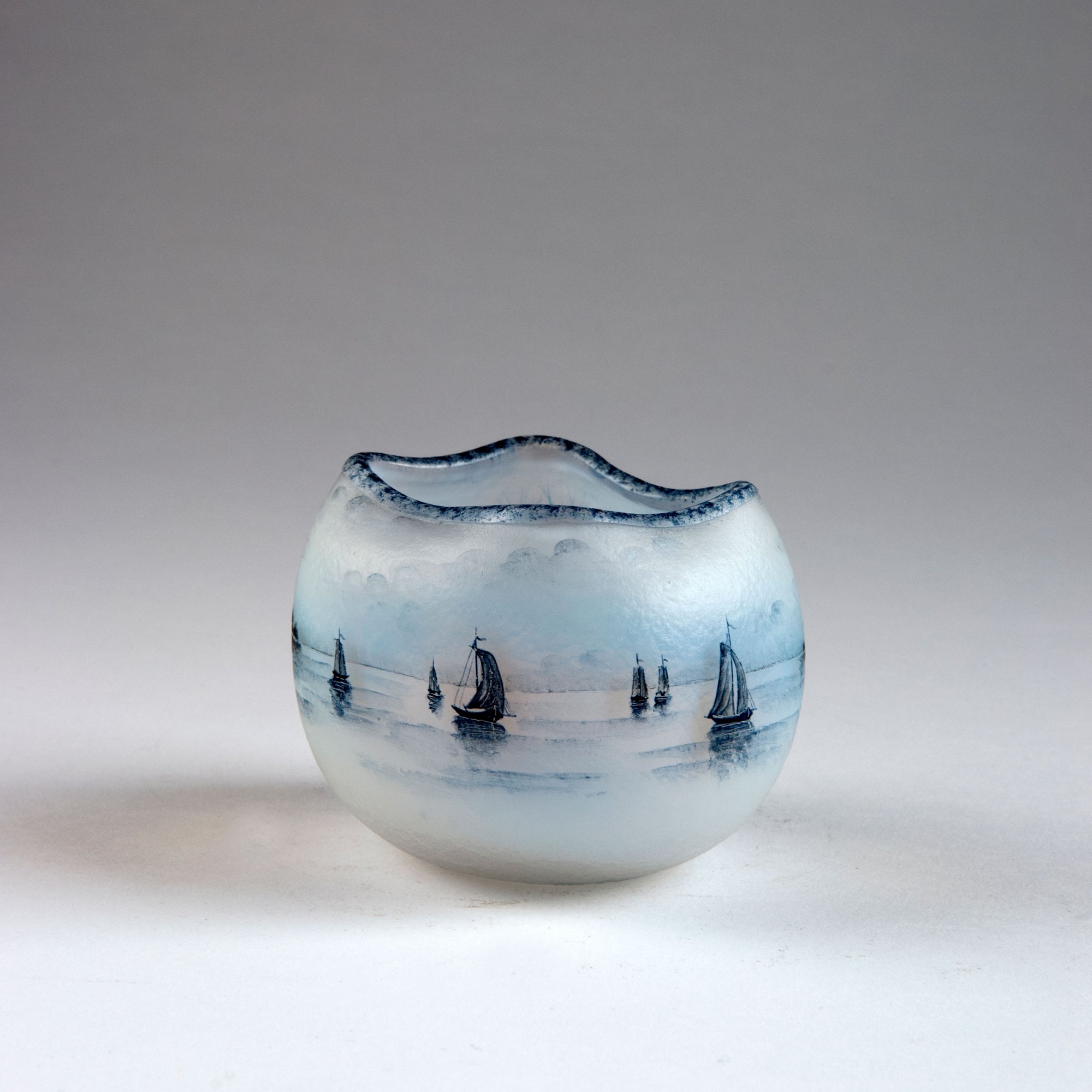 Daum Frères, Nancy. 'Delft' vase, 1899. H. 6.2 cm. Cased glass, milky opalescent and clear. Etched. Grisaille paint. Dutch coastal landscape with windmills and sailboats. Signed: Daum Nancy, cross of Lorraine.