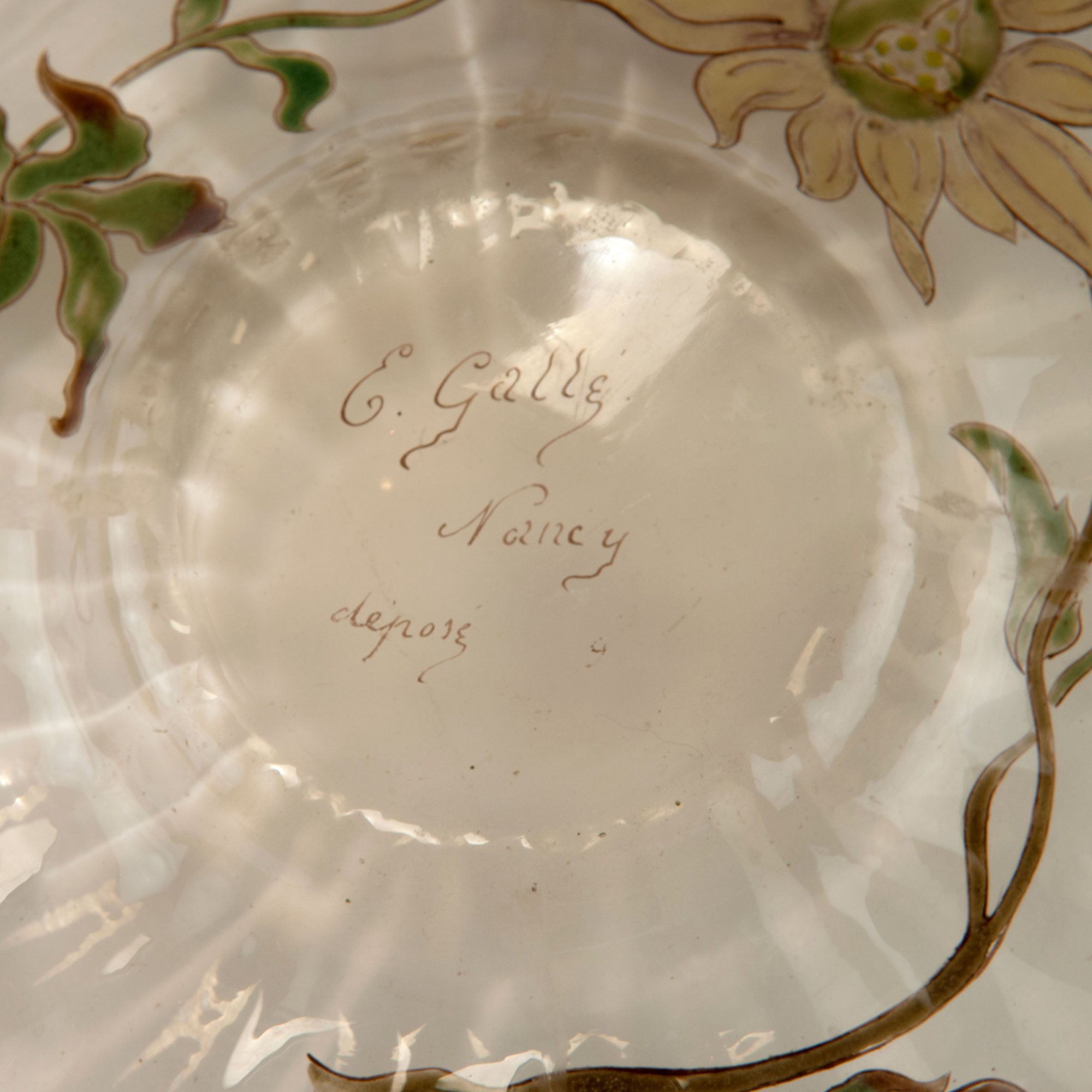 Emile Gallé, Nancy. 'Dahlias' bowl, 1890-94. H. 2.8 cm, D. 16.2 cm. Smoke grey glass, optically blown. Etched and enamelled pattern with dahlias, one flower with applied cabochon, part gilded. Signed: E. Gallé déposé.
