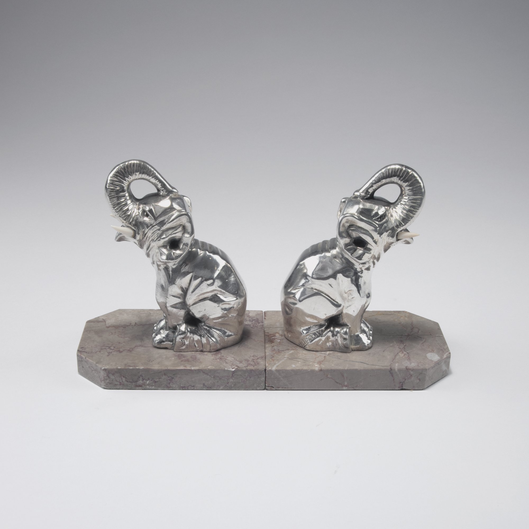 Henri Moreau, Paris. Two 'Elephant' bookends, c1930. H. 14 cm. Chrome-plated metal, grey marble base. Marked: MOREAU.